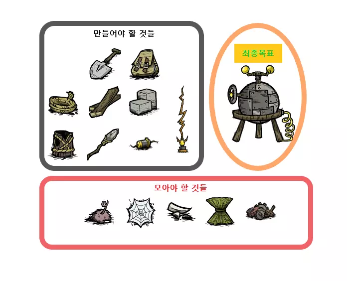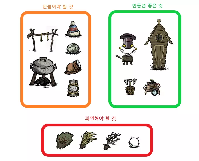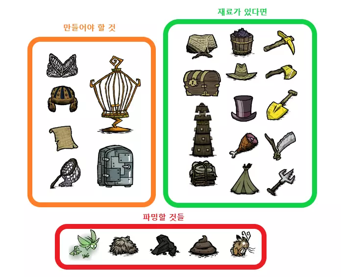 需要优先制作的物品(左侧) 材料充足的话建议制作的物品(右侧) 刷怪探险目标(下方) 左侧物品建议尽量制作好再出发。 需要了解的物品如下: 草 9个 石头 3个 金 2个 蜘蛛网 6个 猪皮 1个 芦苇 8个 齿轮 1个 种子 2个 只要刷怪达到一定程度,难度不算太高。 如果目标包括刷兔子,建议同时准备陷阱。 觉得麻烦的话可以不做或推迟。嫌麻烦的话粪便也可以忽略。 右侧物品也建议尽可能制作。不过,不能出现先制作右侧物品而导致无法制作左侧物品的情况。 [当然,这是我主观设定的优先级。如果您认为右侧物品中某些优先级更高,或者左侧物品中某些必要性较低,完全可以根据自己的喜好重新规划路线。我反而鼓励这样的玩法。] 现在,让我们设下新陷阱、戴上橄榄球头盔、拿起捕虫网、清空口袋,再次出发去刷材料吧。 请刷取下方的物品即可。 [也有些人会先刷取木炭。我是那种喜欢把麻烦的刷取任务往后拖,先做简单事情的类型,所以就把刷木炭的事延后了。 毕竟各位才是玩家,可以尝试各种玩法,按照自己的喜好去刷取资源就好。 现在差不多到最后了。 请看图。