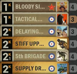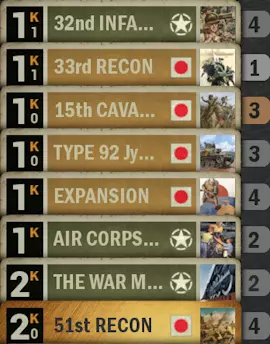 使用【战至最后一人】消灭10个或更多单位 在战斗中达成 提示:要完成此成就,你需要拥有日军指令【战至最后一人】 战场条件需满足: 敌方有6-9个单位且你方有1-4个单位 或者 你方有6-9个单位且敌方有1-4个单位 也就是说,要么敌方控制战场,要么你方控制战场。第一种情况,适合使用带有护卫和牵制指令的卡组。第二种情况,适合使用带有廉价闪电战单位和“抽卡”指令的卡组。两种情况下,美国凭借其增援机制和第32步兵团,都可以作为盟友国家选择。以下是一套通用卡组。