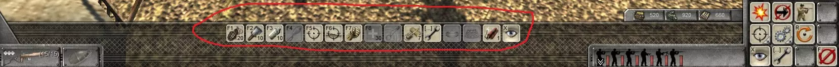 这里有一些可能对游戏有帮助的内容。 从何开始? 如果你不熟悉《敌军前线》系列游戏,请先玩战役模式,至少了解基本操作,这里不再赘述。 基地、指挥部 首先,将重要物品放入快捷栏。也就是“弹药包”(原词:бруствери)。机枪手和步枪手都需要它们。 另外,别忘了有些火炮也有自己的“弹药包”。