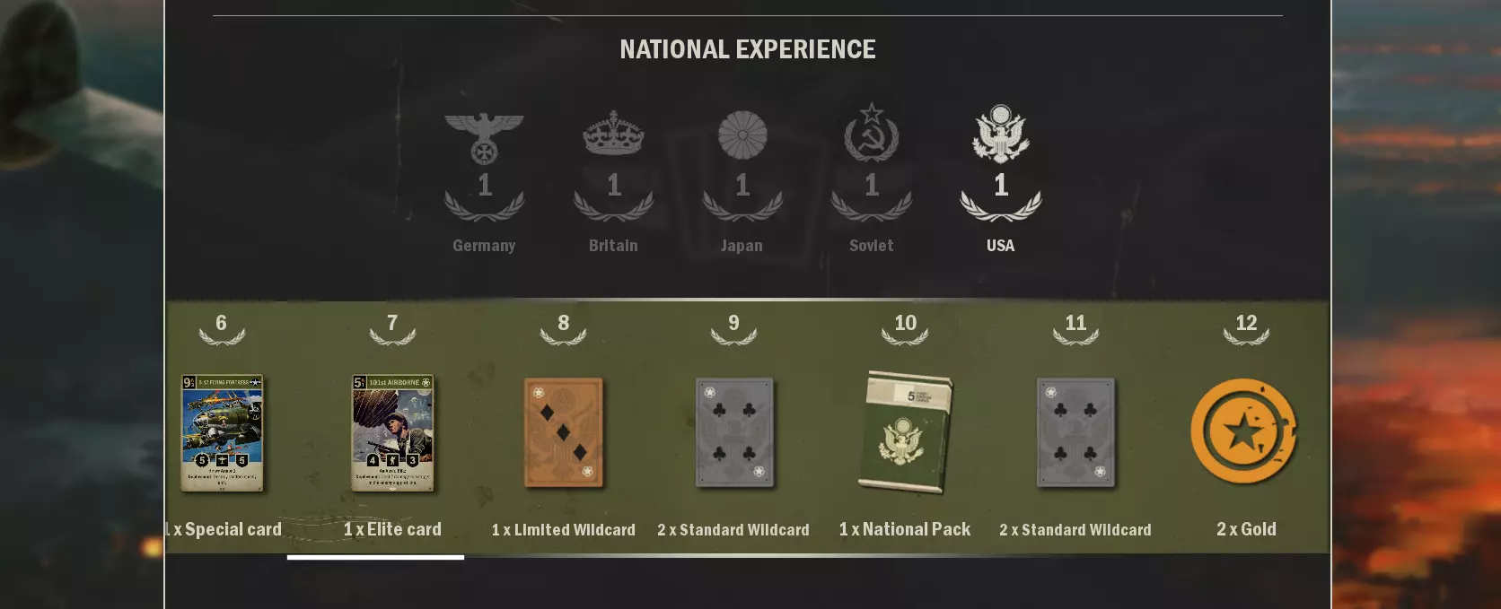 常规包和军官包 战争剧场套装包含5个主要国家(德国、英国、苏联、美国和日本)以及2个同盟国(法国和意大利)的卡牌。 该套装的卡牌总数为40张(3×8、2×7 + 2×1张卡牌)。 撰写本指南时,该套装无法在游戏商店直接购买,可通过游玩战役获得。 突破套装包含5个主要国家(德国、英国、苏联、美国和日本)以及2个同盟国(法国和意大利)的卡牌。 该套装的卡牌总数为105张(5×19 + 2×5张卡牌)。
