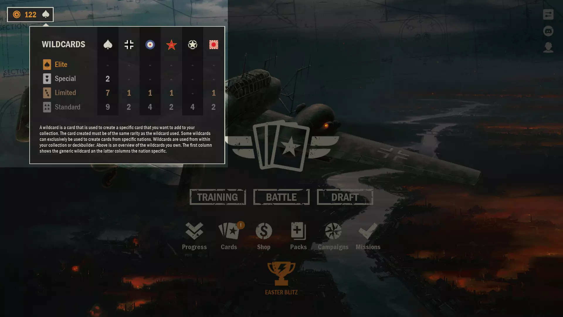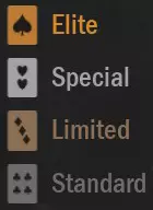 五大主要国家的最高稀有度精英狂野卡牌。狂野卡牌并非您能在收藏中看到并用于战斗的实体卡牌。若要查看您拥有的狂野卡牌——请将鼠标悬停在狂野卡牌图标(黑桃符号)上。届时会弹出一个窗口,显示每种类型的狂野卡牌列表。请注意,无法用一张狂野卡牌兑换另一张狂野卡牌。