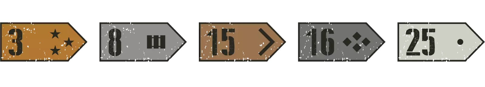 常规包和军官包 军衔系统 共有25个等级,从第25级开始,最高等级为第1级【陆军元帅】。每个军衔/等级都有5颗星,填满后即可晋升到更高军衔。除【陆军元帅】只有1颗星(当你填满第2级【将军】的5颗星后即可获得)外,其他军衔均有5颗星。详见下方第二张图片。