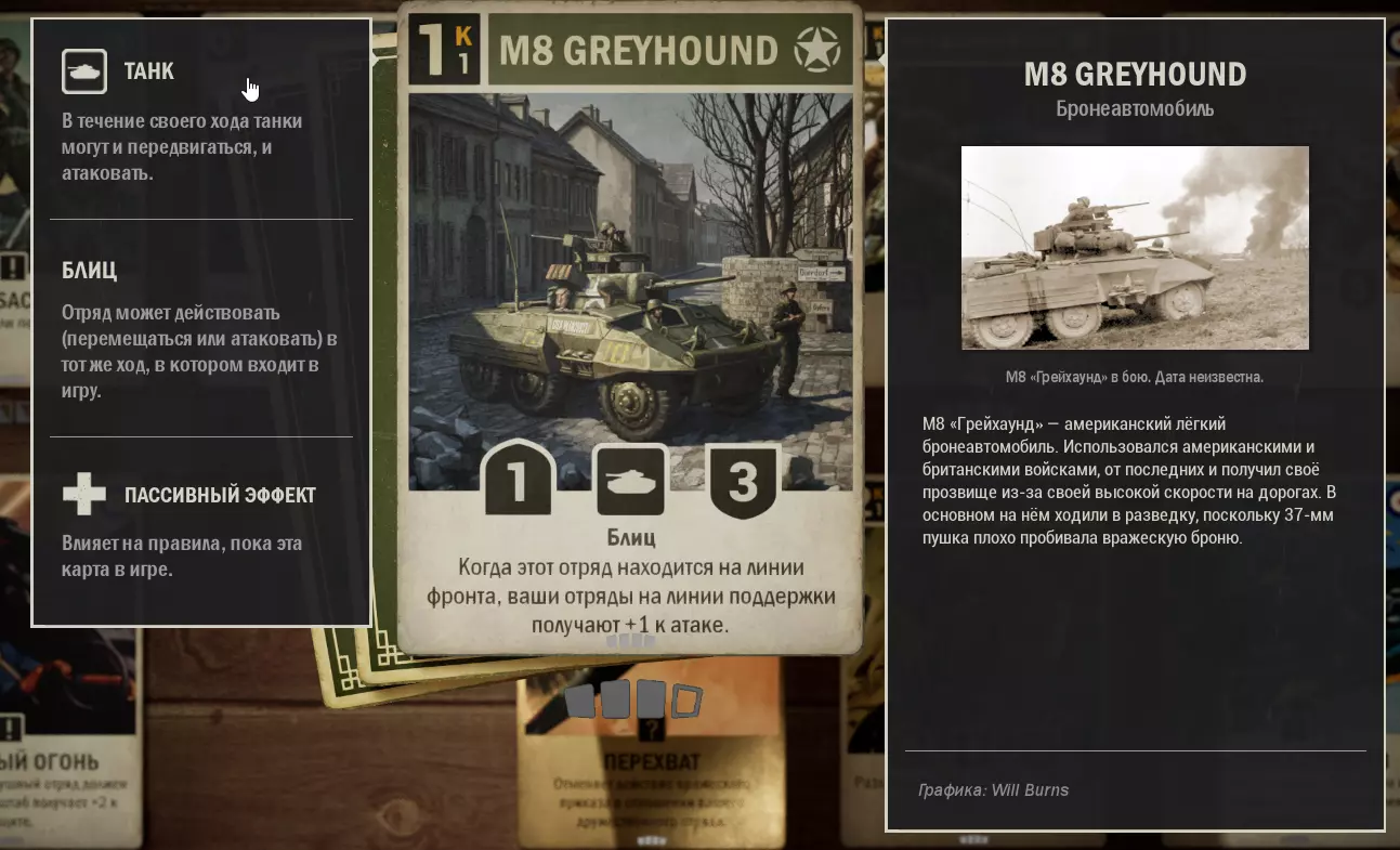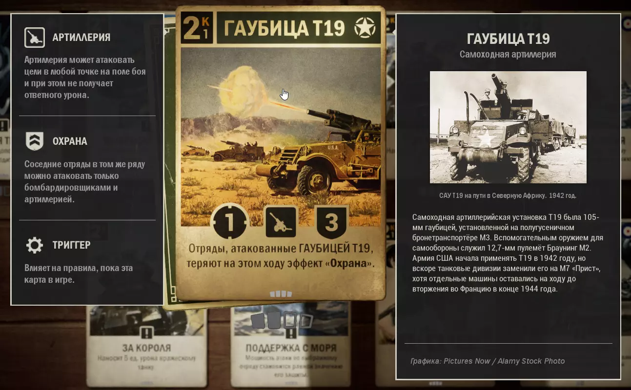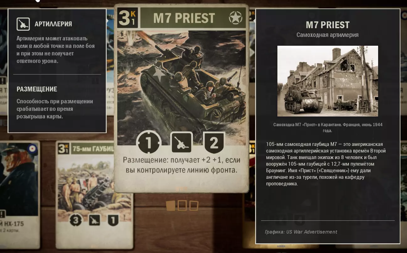 如果前线有M8灰狗装甲车,能对敌人造成不错的伤害。 理想情况下:打出这张卡和M8灰狗装甲车。下回合对榴弹炮使用【海上支援】,然后M8灰狗装甲车移动到前线。结果是:4点攻击和3点耐久。效果很好。也可以在使用【海上支援】前使用【使用】。如果在游戏早期这样做,敌人通常没有卡牌能立即应对。