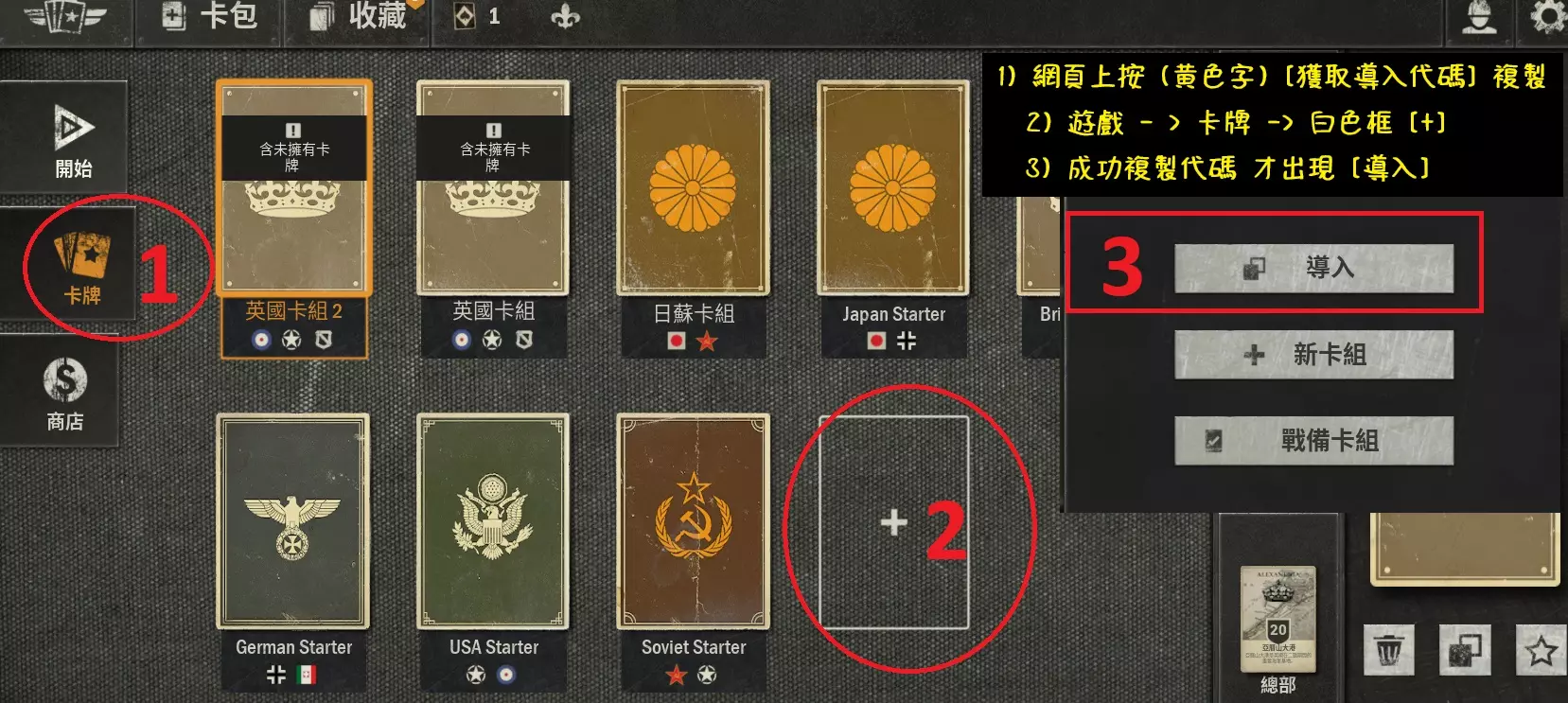 入門 - 新手想要少走歪路 新手到進階的完整指南 KARDS 遊戲攻略:新手到進階的完整指南 歡迎來到 KARDS 的世界!無論你是剛入門的新手,還是希望提升技術的進階玩家,這篇攻略將幫助你更好地理解遊戲規則、資源管理以及組牌策略,助你在戰場上所向披靡。 1. 完成新手戰役 首先,誠實地完成所有新手戰役。KARDS 的主國共有五個:英國、德國、美國、日本、蘇聯。你可以選擇其中之一,並搭配波蘭、法國、義大利等盟國來組建你的套牌。重要提示:在這個階段,暫時不要使用萬能卡。利用新手戰役中獲得的牌來組牌,並將五國等級提升至12級,這樣你將獲得完整的新手套牌,並獲得許多在新手階段看起來非常強力的單卡。 2. 排位賽而非休閒 完成新手戰役後,開始進行排位賽而不是休閒模式。排位賽讓你與技術和牌庫等級相當的玩家對戰,避免在休閒模式中遇到高階玩家測試牌組,導致被虐而失去信心。同時,通過排位賽,你可以逐步熟悉 KARDS 的基本規則和自身的遊戲理解。 3. 忍住不使用萬能卡 在新手階段,避免使用萬能卡,特別是通用萬能卡來替換任何你還不熟悉的牌。將資源投入到一些不那麼強勢但實用的單張卡,避免未來需要升級套牌時資源不足的情況。 4. 選擇第一副爬梯套牌 選擇你的第一副爬梯套牌時,要專注於增強其中一個主國的牌池,這將增加更多的配牌可能性。避免在前期分散資源到多個主國,導致每個國家的牌組都不夠強力。 5. 參加亂鬥 在遊戲初期,定期參加亂鬥區活動。每次亂鬥都有特殊主題,並且首次勝利會有獎勵。這有助於充實你的牌庫。但避免進入競技場,因為競技場對遊戲理解和經驗要求較高,可能會讓新手感到挫敗。 資源消耗 如何管理金幣和鑽石 金幣和鑽石是 KARDS 中的主要資源。以下是如何有效管理和使用這些資源的建議: 鑽石:暫時不建議花費鑽石,尤其是在新手階段。鑽石主要用於購買特殊道具和卡包,但如果不充值,鑽石獲取上限有限。建議等你對遊戲更熟悉後,再考慮如何使用鑽石。 金幣:主要通過每日首勝(20 金幣)和完成任務獲得。每天可以解鎖最多三個任務,並且每天的商店都有一張免費卡牌,記得領取。使用金幣購買卡包的策略: 普通包:適合快速充實基礎普卡。 軍官包:適合追求高稀有度卡牌。 小貼士:保持每日遊玩 利用每日任務和免費卡包來逐步擴充你的牌庫。 第一副爬梯牌 如何選擇你的第一副爬梯套牌 尋求大佬建議:找到可以請教經驗豐富玩家的地方,如 Discord 群組。但在詢問前,先自我評估: 你喜歡哪種類型的套牌? 你目前擁有什麼牌庫? 選擇這副套牌後,還能玩哪些其他牌型? 範例推薦: 喜歡快攻的玩家:可以選擇日本為主國,因為日本有許多快攻底的套牌,重視搶血和交換,適合快速削減對方血量。 案例分析 第一副爬梯牌:日美實驗性飛行 主要國家:日本 盟國:美國 策略:快攻,快速展場,有效削減對方血量,費用普遍低廉,不容易卡費。 成功因素: 選擇符合自己遊戲風格的套牌。 集中增強主國牌池,增加配牌靈活性。 合理使用萬能卡,保持套牌強度。 組牌的一些思路 1. 抓主題 確定你要打什麼樣的套牌,並確保你的主題牌組合完整。例如,實驗性飛行、棄牌生效果等,這些都是你的套牌核心。衡量主題的大小和強度,確保套牌有明確的遊戲計畫。 2. 抓功能曲線 根據套牌的強勢期,設計對應的曲線,確保每個回合都有資源被有效利用。例如,快攻套牌需要低費卡來壓制對手,控制套牌則需要中高費卡來應對對手的威脅。 3. 解場策略 根據套牌特性選擇合適的解場卡。例如,快攻套牌需要便宜且有效的解牌來保護自身單位,而控制套牌則需要強力的掃場卡來應對多數威脅。 4. 調整套牌 根據對局中遇到的困難點,不斷調整套牌。例如,加入抗快攻卡或補充抽牌源,以應對不同的對手和策略。 5. 審視單卡用途 仔細審視每一張卡的用途,確保它們能夠配合你的遊戲計畫。踢掉用途狹窄或費用笨重的單卡,保留那些在不同情況下都有用的多功能卡。 常見錯誤 隨意塞牌:照喜好塞一堆強卡,導致套牌不協調。 感覺式組牌:僅依靠感覺來抓曲線,缺乏系統性。 缺乏思路:組牌前沒有明確的策略和目標,導致套牌運行不順暢。 組牌方法步驟一:抓主題 確定套牌的主要策略和核心牌,例如實驗性飛行、棄牌生效果等。這些核心牌將驅動整個套牌的運行。 步驟二:抓功能曲線 根據套牌的強勢期設計合適的費用曲線,確保每個回合都有資源被有效利用,支持套牌的整體策略。 步驟三:衡量解場需求 選擇合適的解場卡來應對不同的威脅,根據套牌特性選擇便宜且有效的解牌。 步驟四:調整套牌 根據對局中遇到的問題,不斷調整套牌,加入必要的抗快攻卡或抽牌源,以提升套牌的靈活性和應對能力。 步驟五:審視單卡用途 確保每一張卡都能夠配合套牌的整體策略,踢掉那些用途狹窄或費用笨重的卡,保留多功能且高效的卡牌。 實例分享 第一副爬梯牌:實驗性飛行 (94) 主要國家:日本 盟國:美國 HQ:特魯克 日本牌組(88 點): 快攻卡牌:如 P1Y 銀河陸爆、九四式輕裝甲車、習志野騎兵聯隊等。 支援卡牌:如 神風行動、靜岡聯隊、搜索第56 聯隊等。 美國牌組(6 點): 供應鏈 M8 灰狗 卡均油水值:2.4102 成功因素: 集中增強日本的快攻牌池。 合理搭配盟國美國的支援卡,提升整體套牌的靈活性。 保持低費曲線,確保每個回合都有資源被有效利用。 結語
