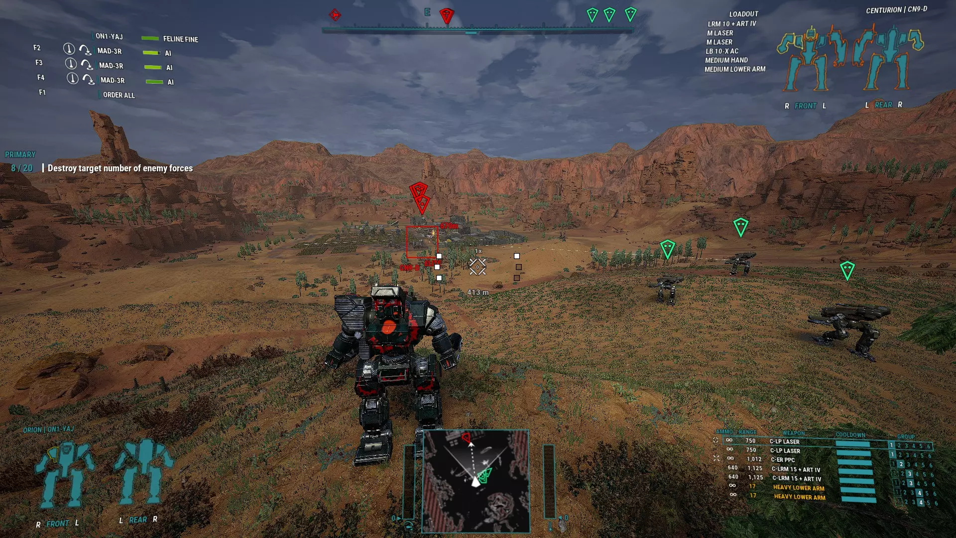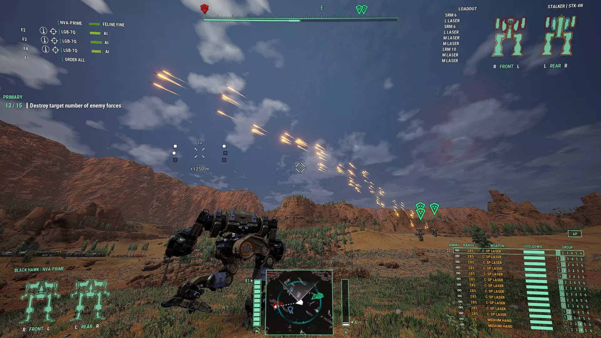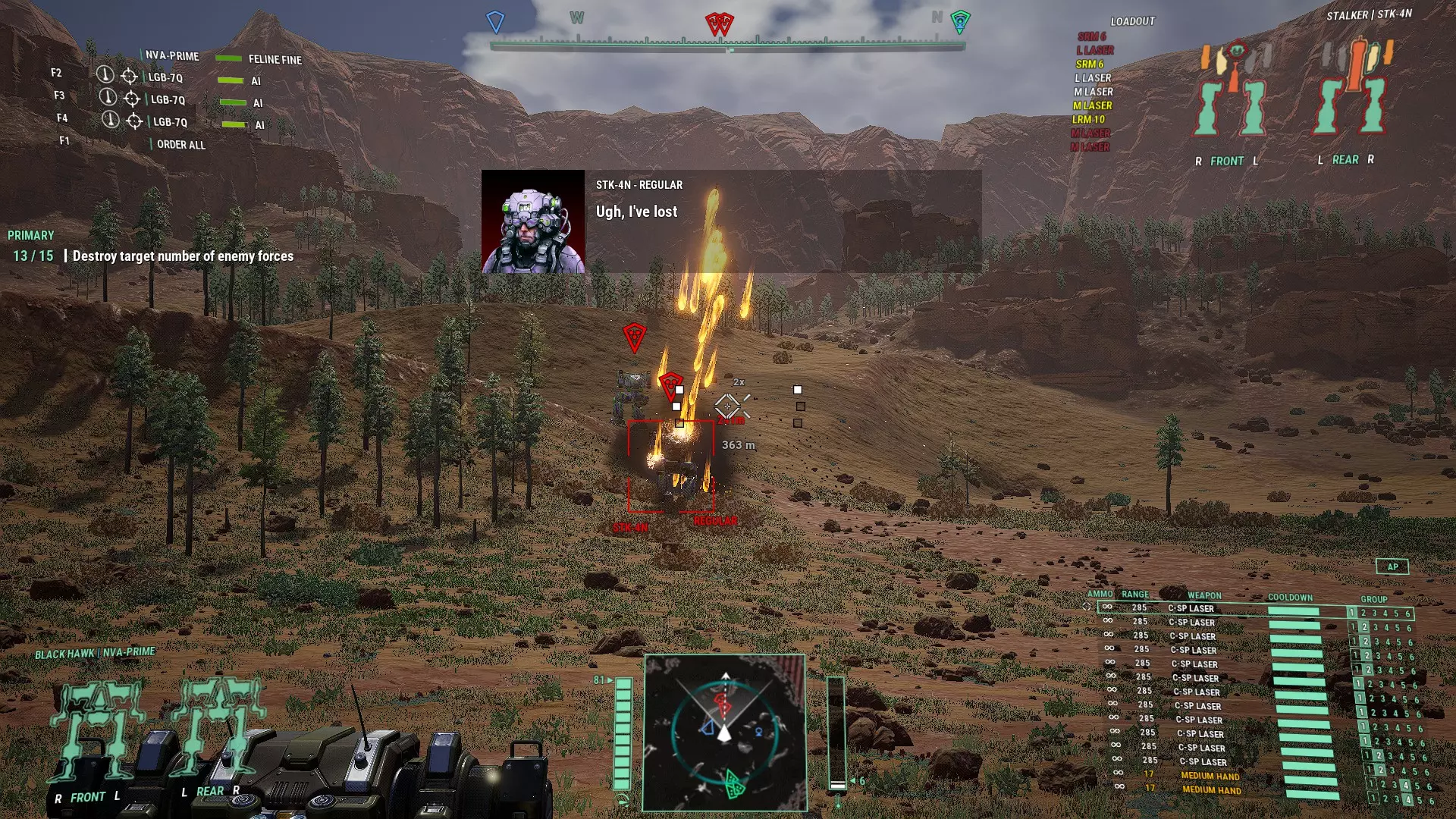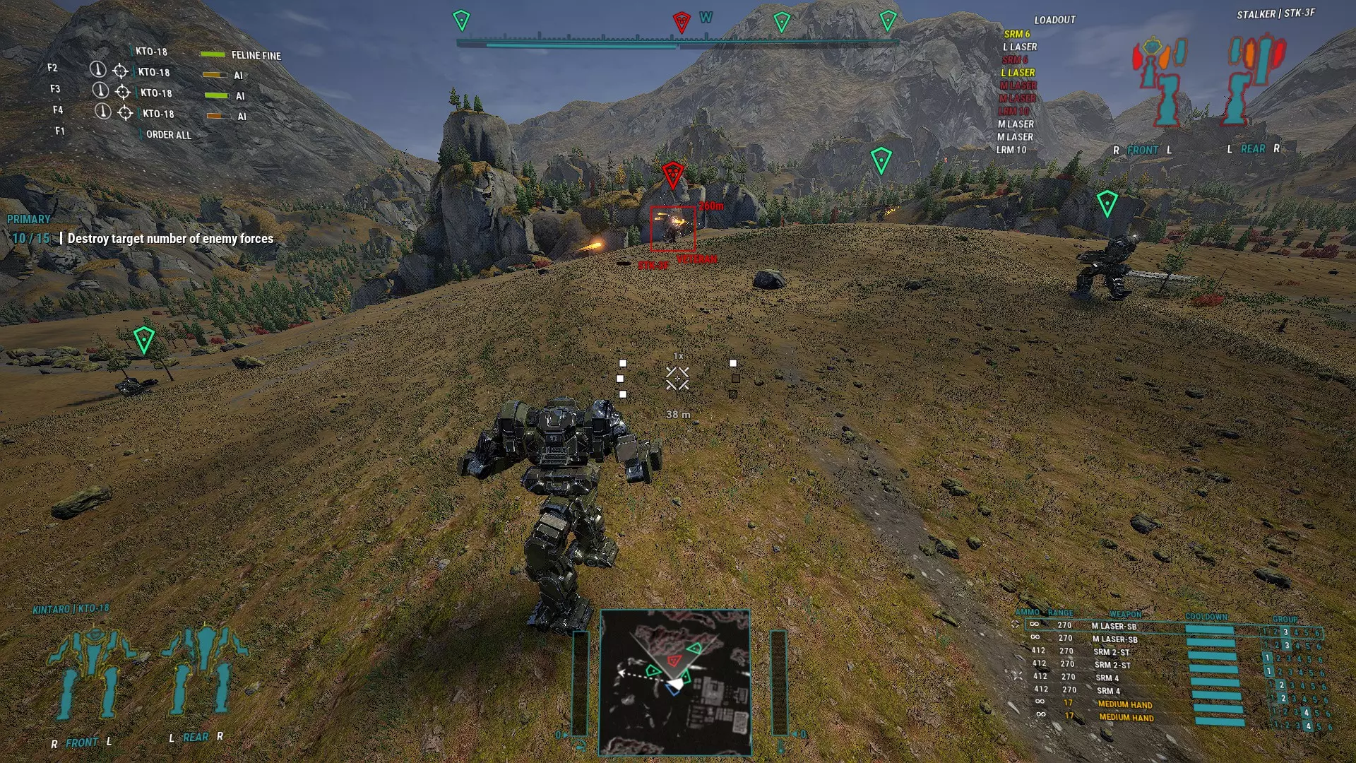Maintain spacing, stay within range. Brawler Lancemate This loadout is for close combat or where trading blows with the enemy is unavoidable. The build is simple: Fast mech for better movement, to avoid damage, get close and flank. Max armor. Damage will be traded. Spam PPC-X, all Medium Laser types, all Small Lasers types and SRMs. Still mind the heat and weapon groupings. The name of the game is fire as many weapons as possible consistently and without shutting down. Under 400m opens up nearly every weapon in the game to fire so your AI lancemates must out DPS your enemies. A very important but much looked over function at this range is facing. How fast can your AI mech torso twist to face the enemy so it can bring it's weapons to bear. How long will your AI mech face the enemy and in turn receive a face full of return fire. How long will your AI mech focus on an enemy exposing their rear to enemy teammates. At this range, there aren't many places to run. This is why short bursting lasers, PPC-X and non-ST SRMs are preferred for torso hard points to reduce the amount of time the AI will stare at an enemy. This is also why most light and medium mechs will excel with this build because the running speed and torso twist rates are much better than heavy and assault mechs without the torso twist and speed boost upgrades. Keep in mind, lock on weapons will increase facing time. Streak SRMs are decent weapons and the AI can actually employ them well especially when Elementals arrive on the battlefield. Just keep note that regular SRM and the Artemis versions will fire faster and disengage faster at the cost of accuracy since they don't require lock on. It is highly recommended to not use the Stream (ST) versions because the missiles move too slow for AI to compensate and will miss a lot while increasing facing time. This will leave you with the standard versions that will have wider spread which will spread the damage but any damage is better than no damage. Larger launchers will have a wider spread while also reloading slower so it is recommended to carry or group the same size launchers if possible. SRM2s will be ready to fire much faster and spread less so if you have the hard points, spam them. Artemis SRMs are not worth the additional weight. At the range these SRMs are being fired, the spread improvement is negligible. Since the weapons at this range have specific quirks, it is recommended that the same weapons are grouped together. Medium Lasers with Medium Lasers, Small Lasers with Small Lasers, SRMs with SRMs, etc. Also it is wise to separate torso and arm weapons at this range since arms move faster and have a wider field of fire than the torso. This will allow arm weapons to fire first instead of waiting for the torso to line up. You may notice I mention Small Lasers and not Machine Guns or Melee Weapons. If you have a lot of ballastic hardpoints, and I'm talking A LOT, Machine Guns can be a menace in sword swinging range but the chances for these to come into play are far and few inbetween. While awesome to witness an AI blow apart torso armor with 2 Assault Arena Fists and then watch them use 8 Machine Guns to core it out, you will probably get more mileage out of Small Lasers; Standard, Short Burst or Pulse. This is because: Almost double the range of Machine Guns so they will be used more. More mechs have multiple energy hardpoints than ballistic hardpoints for spam to matter. Slightly more damage than Machine Guns but much better point damage. Half the heat and weight of corresponding Medium Laser equivalents while providing less than half the damage at twice the rate of fire. If you have the hardpoints, 2 Small Lasers will outperform a single Medium Laser. This will help maximize DPS for certain builds where you can't mass enough Medium Lasers due to heat constraints. It's usually easier and cheaper to obtain Tier 4 and 5 versions compared to Medium Lasers Due to maths, Small Lasers benefit more from energy weapon range upgrades than Machine Guns do from ballistic weapon range upgrades. The above 2 points can result in Small Lasers with almost the range of a Tier 1 Medium Laser (405m) while firing twice as fast at a quarter of the heat with 80% of the damage per shot.Clan Small Lasers are a league of their own as they're better than a tier 5 IS Medium Laser on all stats. So if you have the hard points, try a Small Laser and SRM build. If you want to be a special kind of pain, equip your entire lance with Inferno missiles so you can watch Assault mechs shut down and melt away from barrage of 48 Infernos. Example BuildKintaro KTO-18 Weapons Group 1 2 x Medium Laser - SB (RA, LA) Weapons Group 2 1 x SRM4 (LA) Weapons Group 3 2 x SRM4 (RT, CT) 2 x SSRM ammo (RL, LL) 6 x Single Heat Sinks (HD, CT, RT, LT) Max Armor This build works from 3015 and can be upgraded with Lostech and Clan equipment as the technology becomes available. Lostech introduces double heat sinks and SSRM2s. With the 4 missile hard points on the Kintaro, SSRM2s can be spammed to be effective but SRM4s might still outperform depending on circumstance. Clan tech will allow 4 Clan SSRM4s to be installed and the Medium Lasers can be replaced with Clan Small ER Laser for the low heat penalty but similar range and damage. One might be tempted to spam SRM6s but the heat penalty will affect the rate of fire. While the total damage output would work against a single opponent, MW5 launches multiple lances at you so your AI companions don't have the luxury of waiting around. This is one of the reasons why the Wolverine is one of the most effective vanilla mechs for AI because the total heat generated from it's weapons can be handled by it's heat sinks.