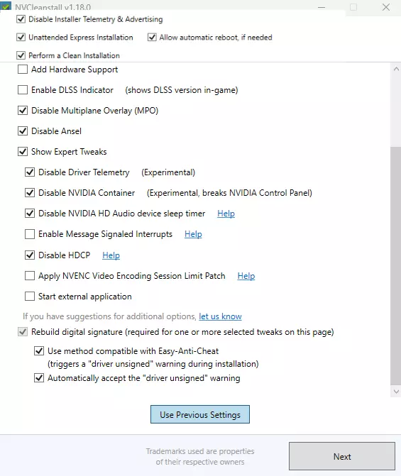 这些命令会在游戏中启用多线程,从而带来不错的性能提升。之后进入文件属性,勾选【只读】选项。当游戏更新时,Steam可能会提示文件访问被拒绝。只需取消勾选文件“只读”属性,问题即可解决,但文件中的这些命令可能会丢失,或者某些数值可能会发生变化(部分数值可能变为“0”,因此请检查)。运行游戏时,选择“Show game launcher”,并勾选“总是使用此选项”。当您点击“Run”按钮后,游戏可能会提示无法访问“boot.config”文件,因为该文件处于只读模式。你只需点击“确定”,游戏就能正常启动,不会有任何问题。 如果你和朋友一起玩,启动时可以取消勾选“Use EasyAntiCheat”。此外,在“渲染器”中可以选择“Vulkan”,因为在部分系统中这也能提高帧率。关闭日志记录:在启动命令中输入以下内容:-logfile nul -nolog,这将加快地图加载速度并略微提升性能。安装不包含多余组件的NVIDIA驱动程序:在操作之前,请完整阅读。如果您不使用NVIDIA的图像滤镜、不使用NVIDIA的屏幕录制功能,或者不使用GeForce Experience,那么可以驱动程序精简在性能和画面流畅度方面有非常积极的效果!首先需要下载NVIDIA驱动程序。然后需要下载NVCleanstall程序(稍后会用到)。之后需要使用DDU程序卸载旧驱动。进入网站,向下滚动并点击“Click here for DOWNLOAD & SUPPORT”,然后点击“*** Download DDU "Portable / self-extracting" ***”,运行文件并解压到任意文件夹。启动程序,在设置中进行如下操作:(如果您使用的是AMD处理器,请取消勾选“AMD驱动程序设置”)