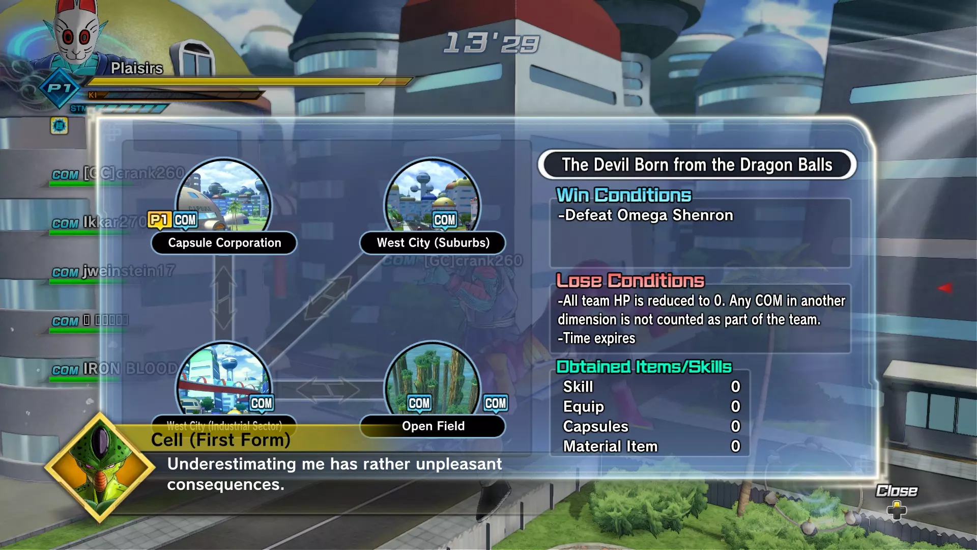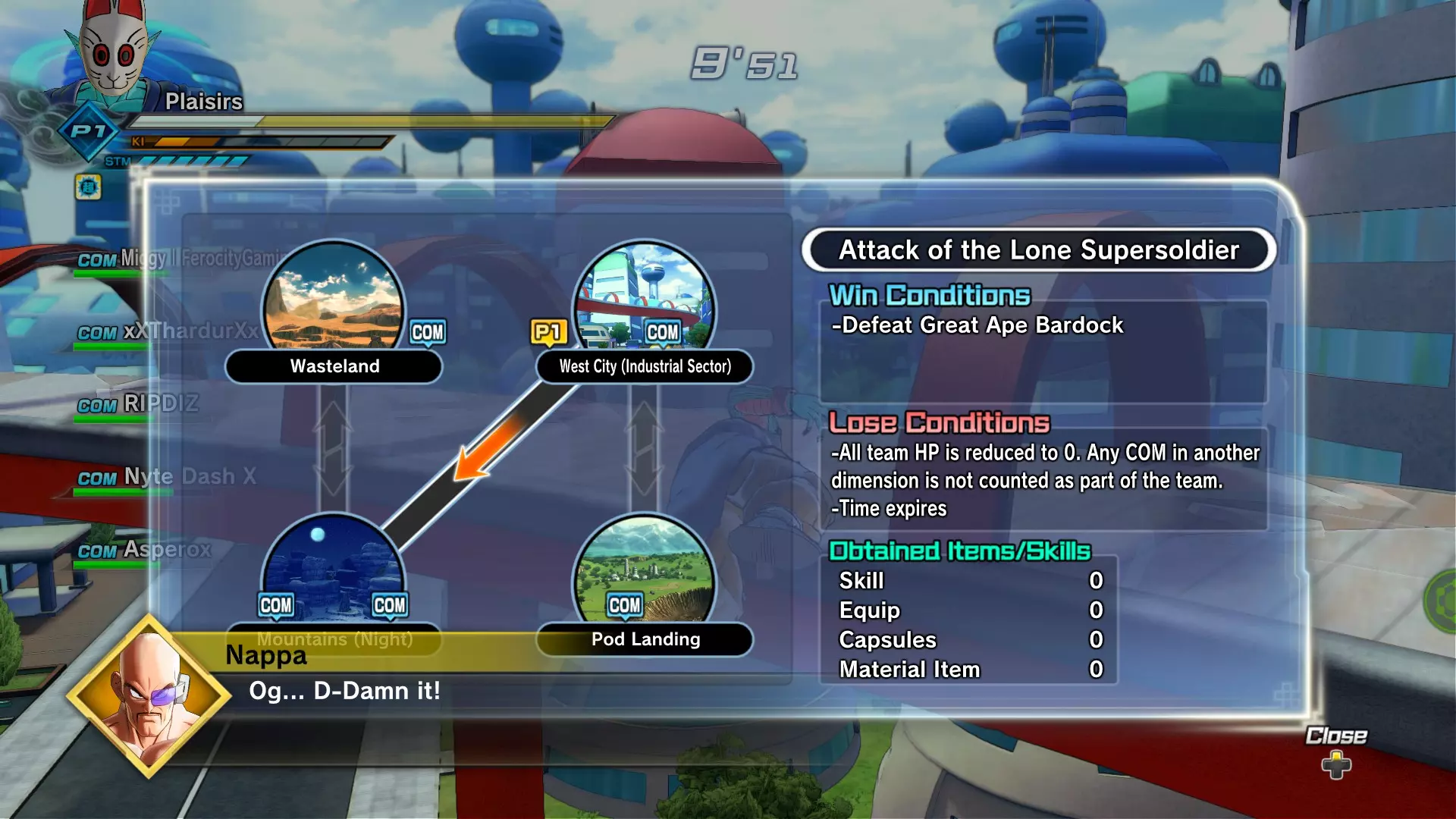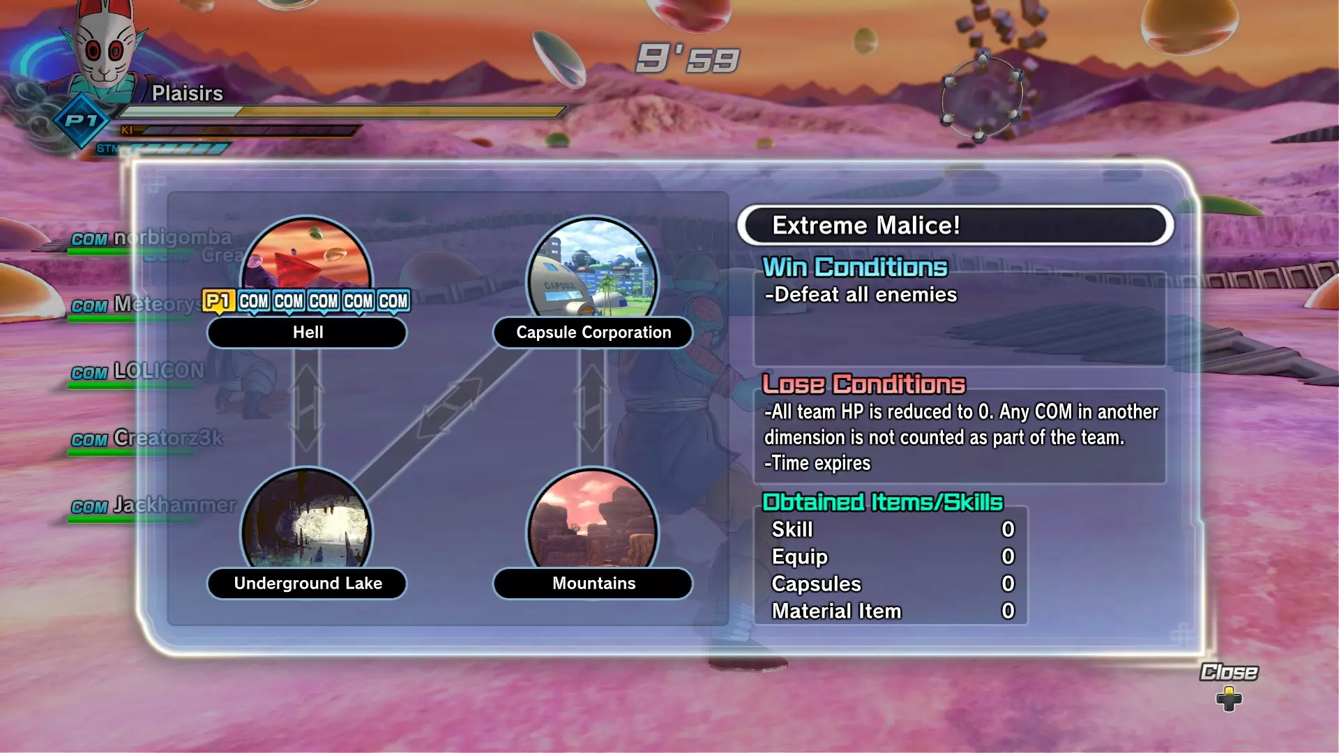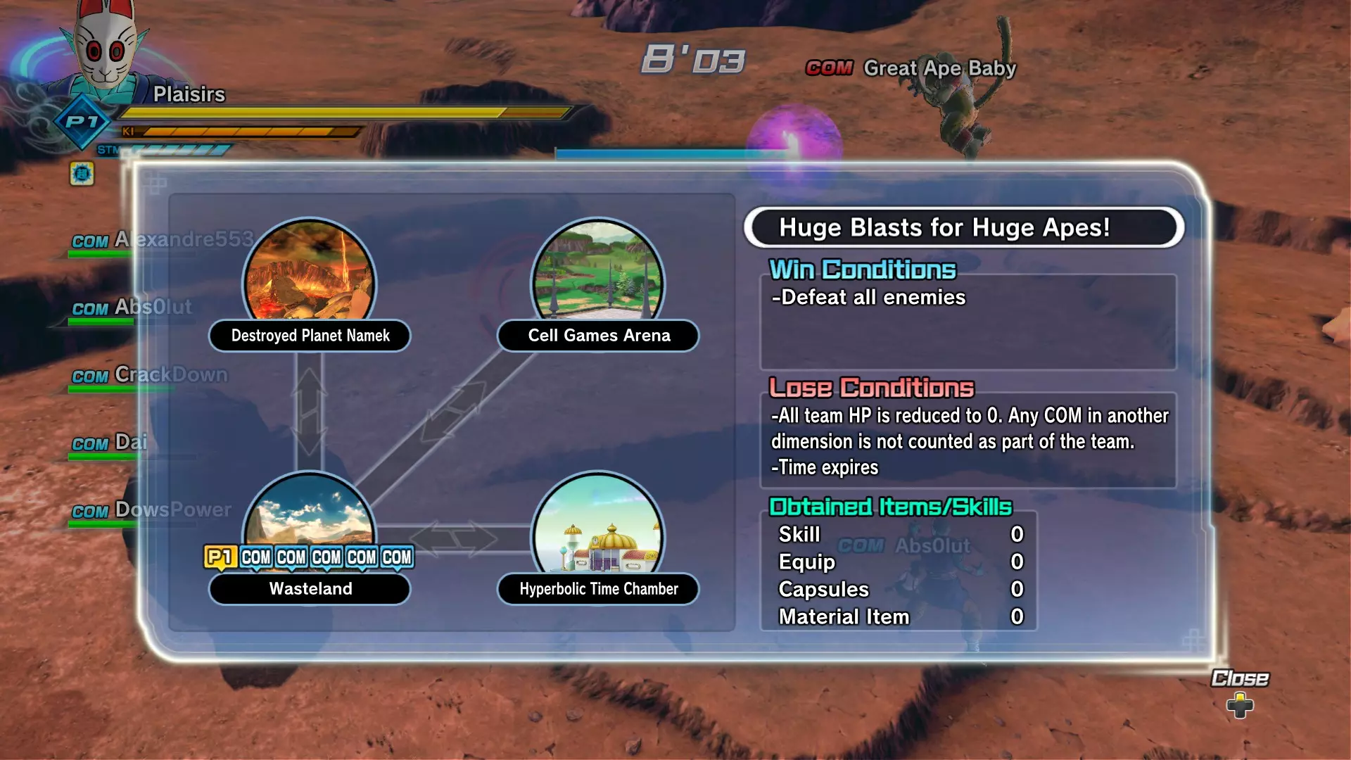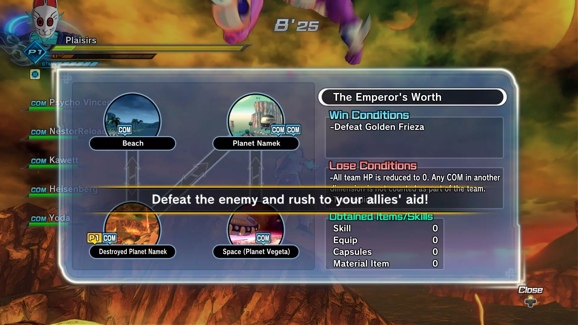 如果你被传送到已毁灭的那美克星,你只需击败一个对手就能回到弗利萨那里。如果你被传送到弗利萨的飞船,你需要先击败你的对手,然后使用传送门前往那美克星,接着再通过传送门前往已毁灭的那美克星,之后使用传送门回到弗利萨那里。需要注意的是,虽然我说必须使用传送门,但如果你在飞船区域比其他区域的队友更快击败对手,你还得去其他区域帮助他们击败各自的对手!如果他们速度够快,你就只需直接通过传送门即可。 如此循环往复,直到战斗结束。 11:诞生于龙珠的恶魔 真正的挑战从这里开始。 信息: