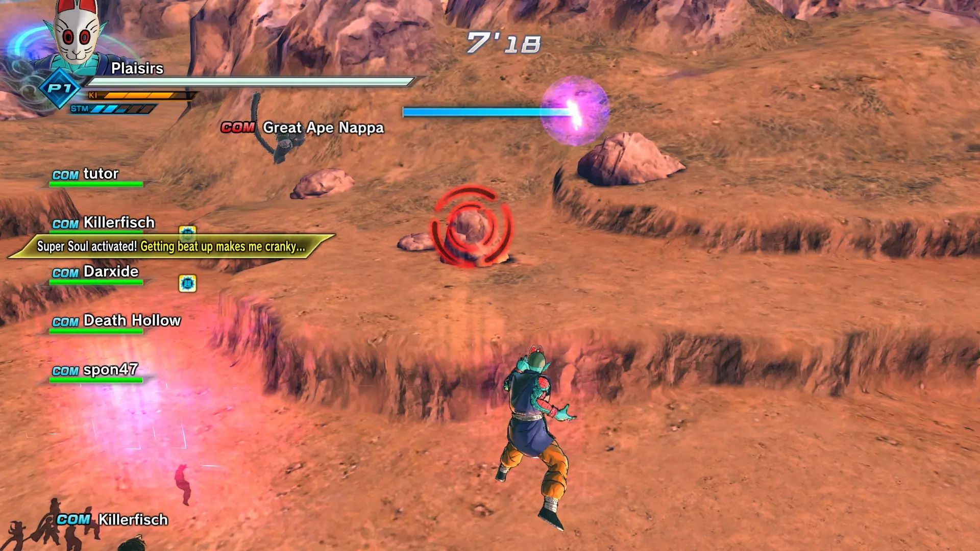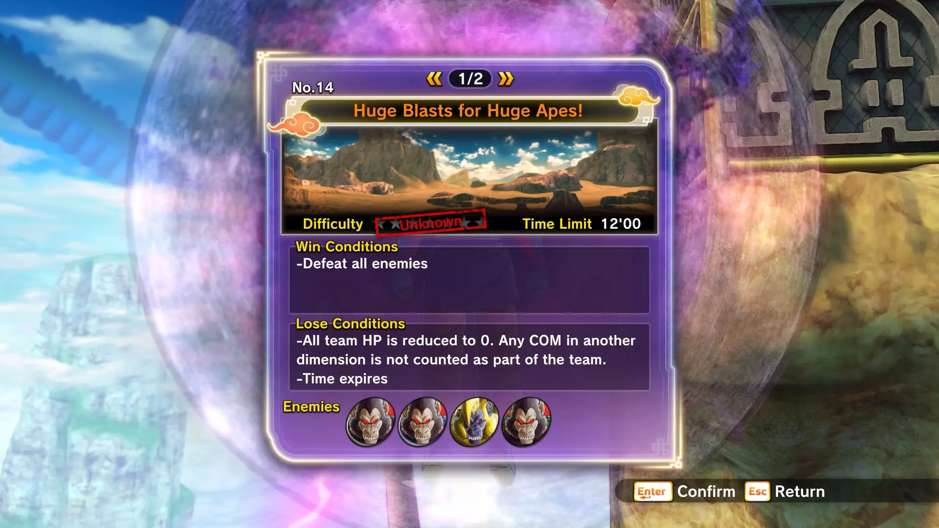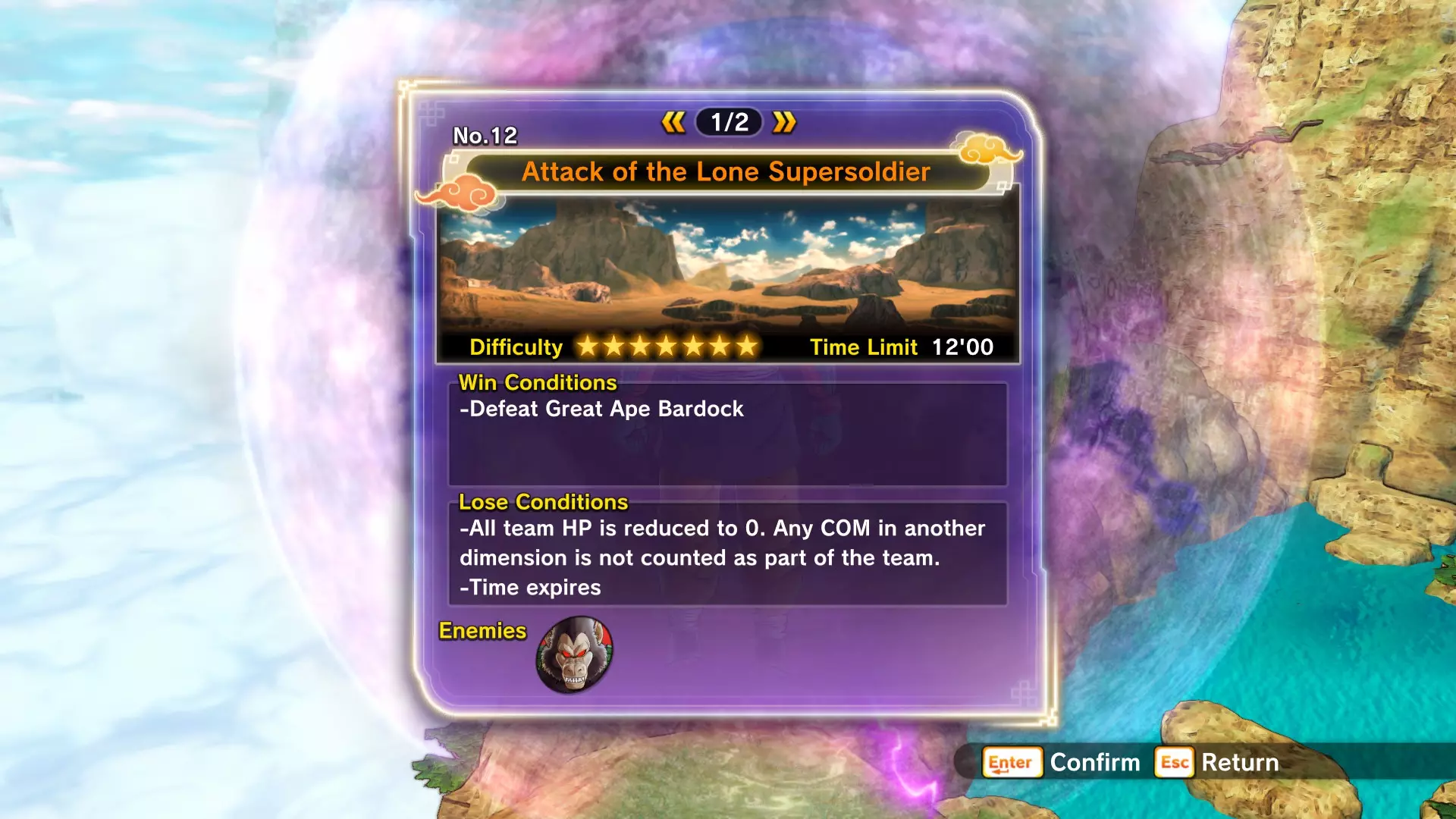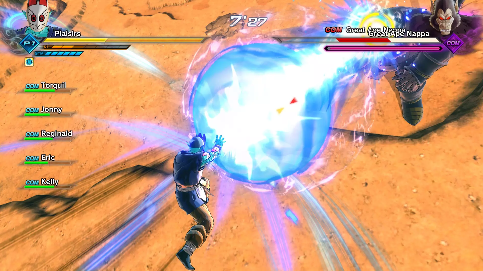 补充信息: 你将面对4名对手,他们从你在故事模式和PQ任务中遇到过的敌人中挑选。部分对手处于普通状态,部分则会展现全力。普通状态的对手不会使用花哨招式,但全力状态的对手会施展精神控制和巨型气功波。 注意,无论在线还是离线模式,巨型气功波的位置都存在一些bug。由于战斗场地相当狭小,这种情况会频繁发生。有时气功波不会造成伤害,有时则会(但伤害会降低)。 14:巨型气功波对抗巨型猿猴!