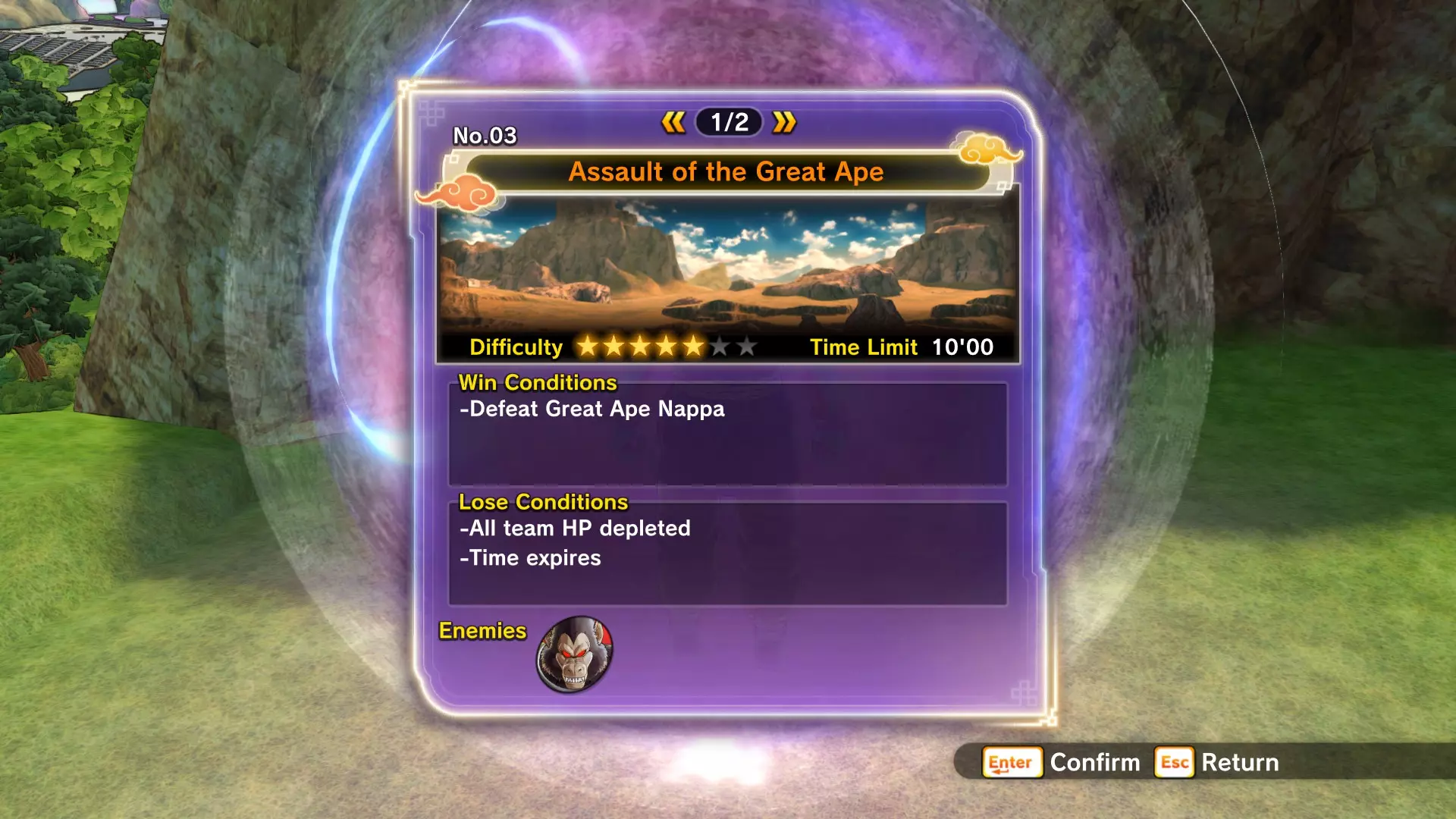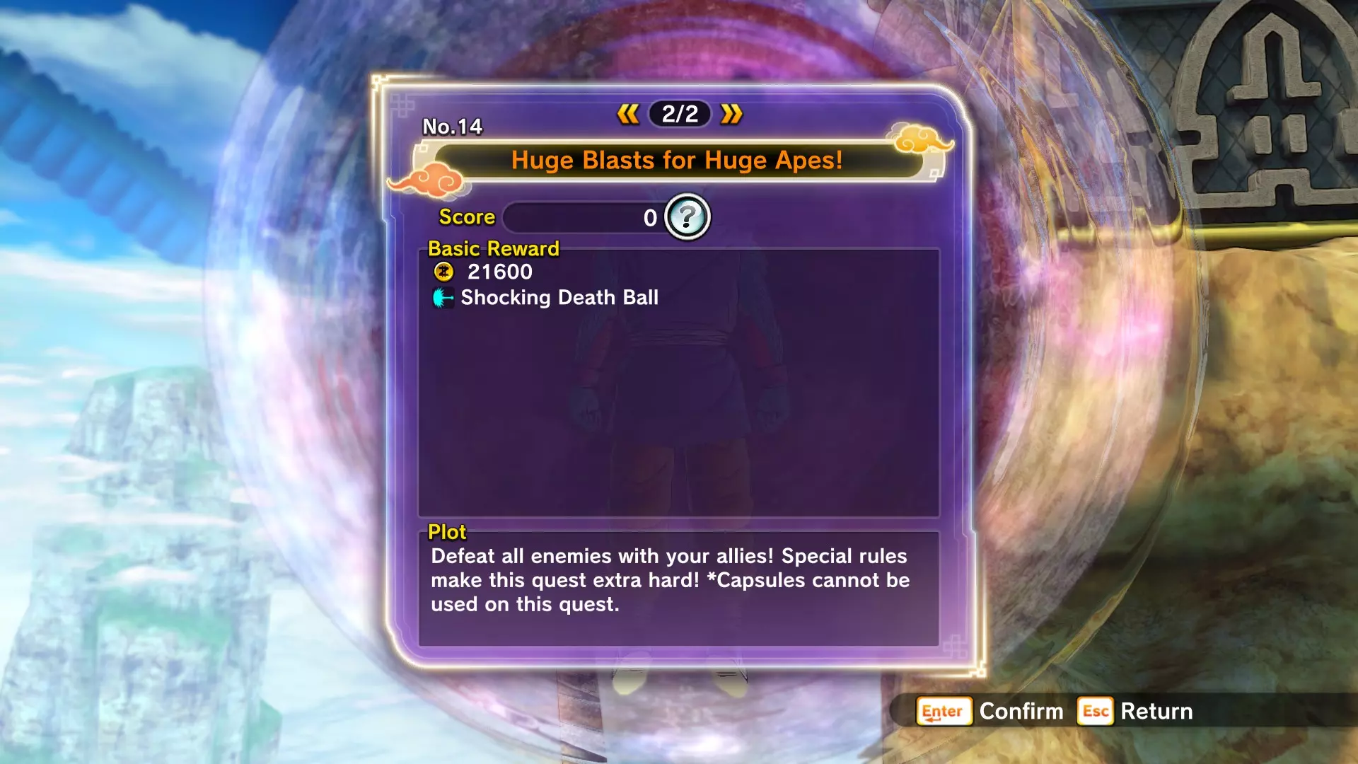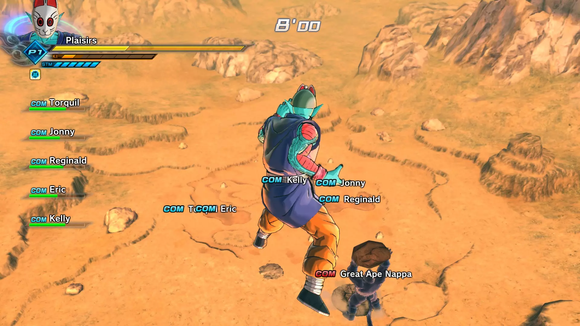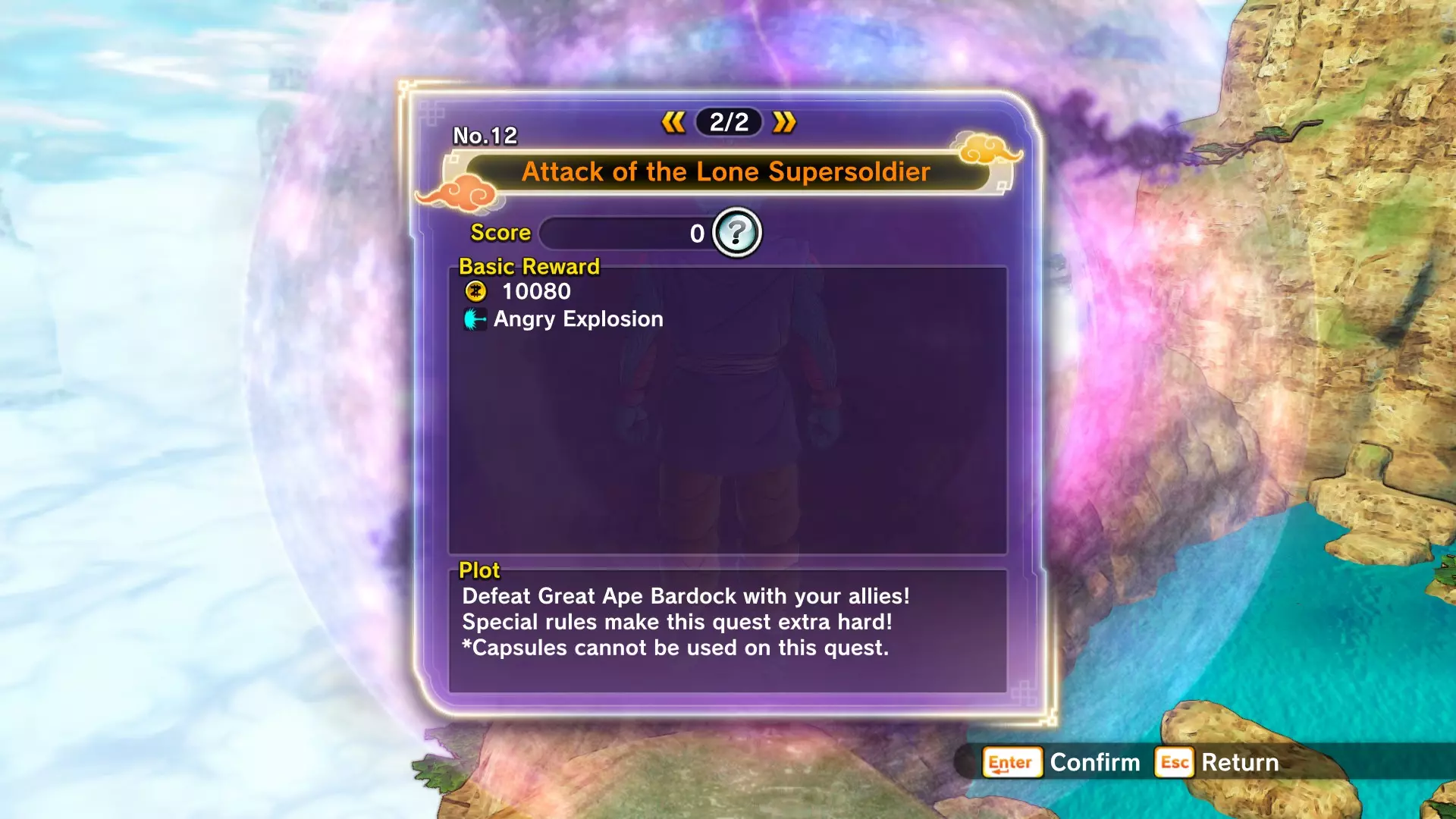 补充信息: 你将面对4名对手,他们从你在故事模式和PQ任务中遇到过的敌人中挑选。部分对手处于普通状态,部分则会展现全力。普通状态的对手不会使用花哨招式,但全力状态的对手会施展精神控制和巨型气功波。 注意,无论在线还是离线模式,巨型气功波的位置都存在一些bug。由于战斗场地相当狭小,这种情况会频繁发生。有时气功波不会造成伤害,有时则会(但伤害会降低)。 14:巨型气功波对抗巨型猿猴!