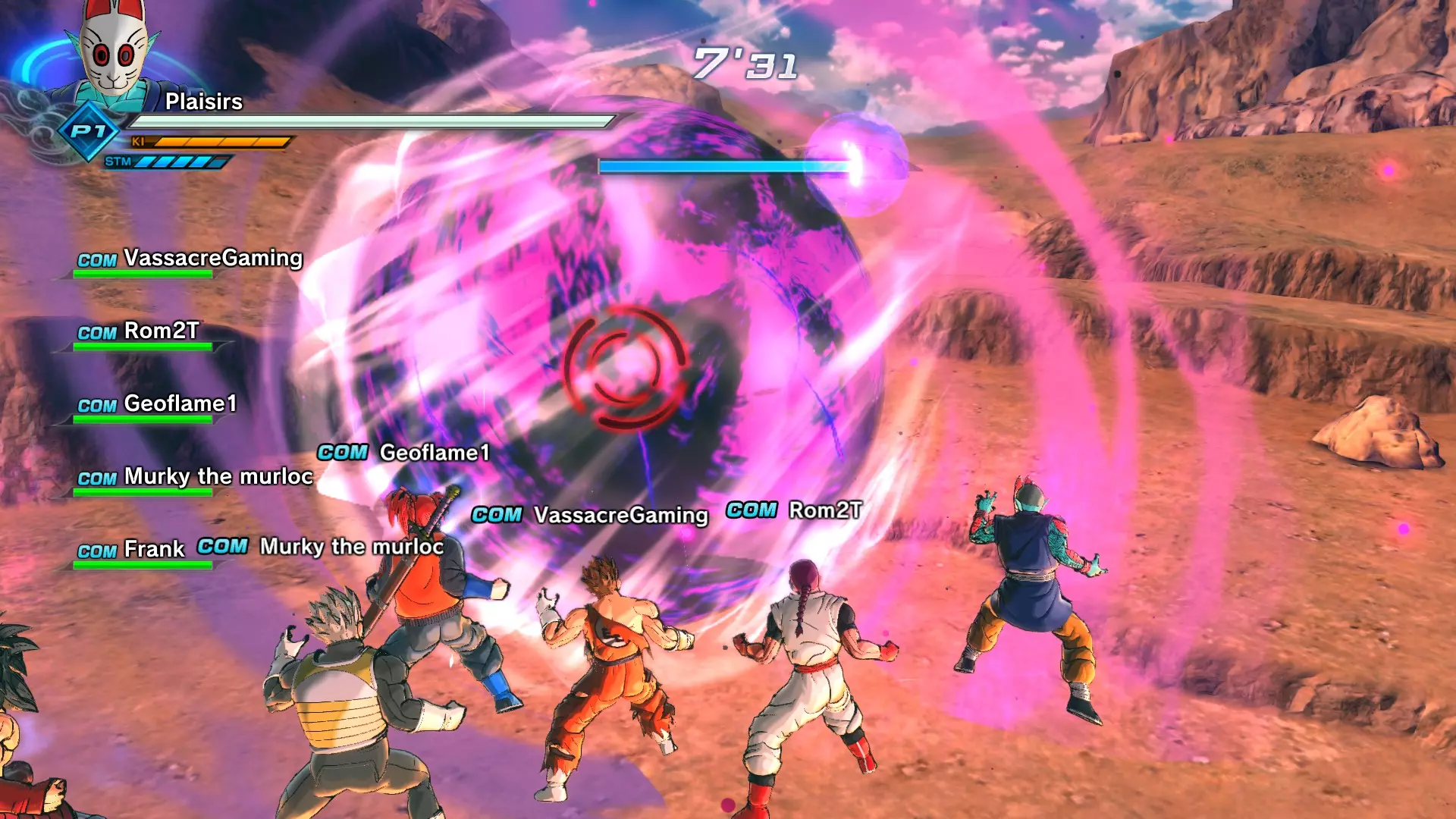 爆炸离得很近,但在“墙”的另一边。你无法靠近并推动它,靠近时它会填充你的气并消耗你的耐力,但你可以用龟派气功攻击它。如果团队配合得当,实际上可以将爆炸反弹回对手那里! 通常,如果你能成功反弹爆炸,敌人会在地图边界内重生或传送回来,这样你就能正常攻击和战斗。如果无法反弹,敌人有时会待在边界外,有时会回到边界内。如果对手也刚好在边界外,大多数情况下你可以用瞬间移动接近他。看看下面的图片,你会发现我已经远远超出了地图的正常高度限制,并且处于“墙”的敌人一侧。