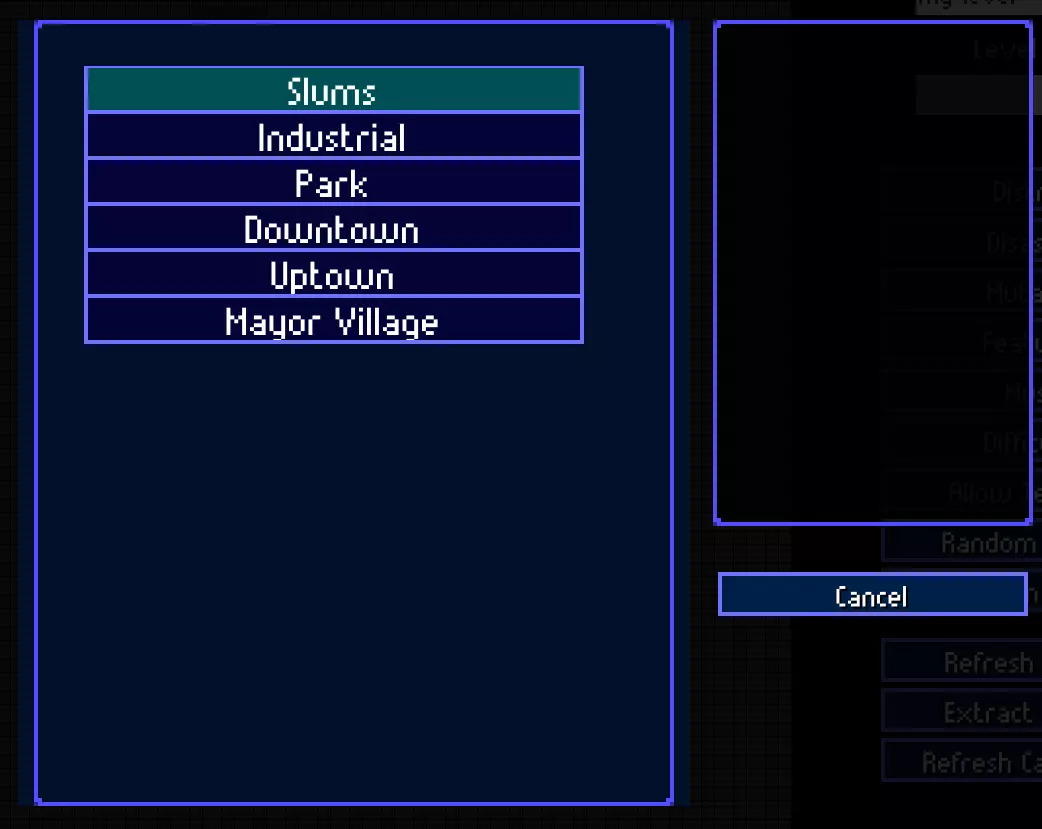 【区域】决定了部分生成特性。例如,黑帮和运河只会在市中心生成,而洞穴只会在公园生成。