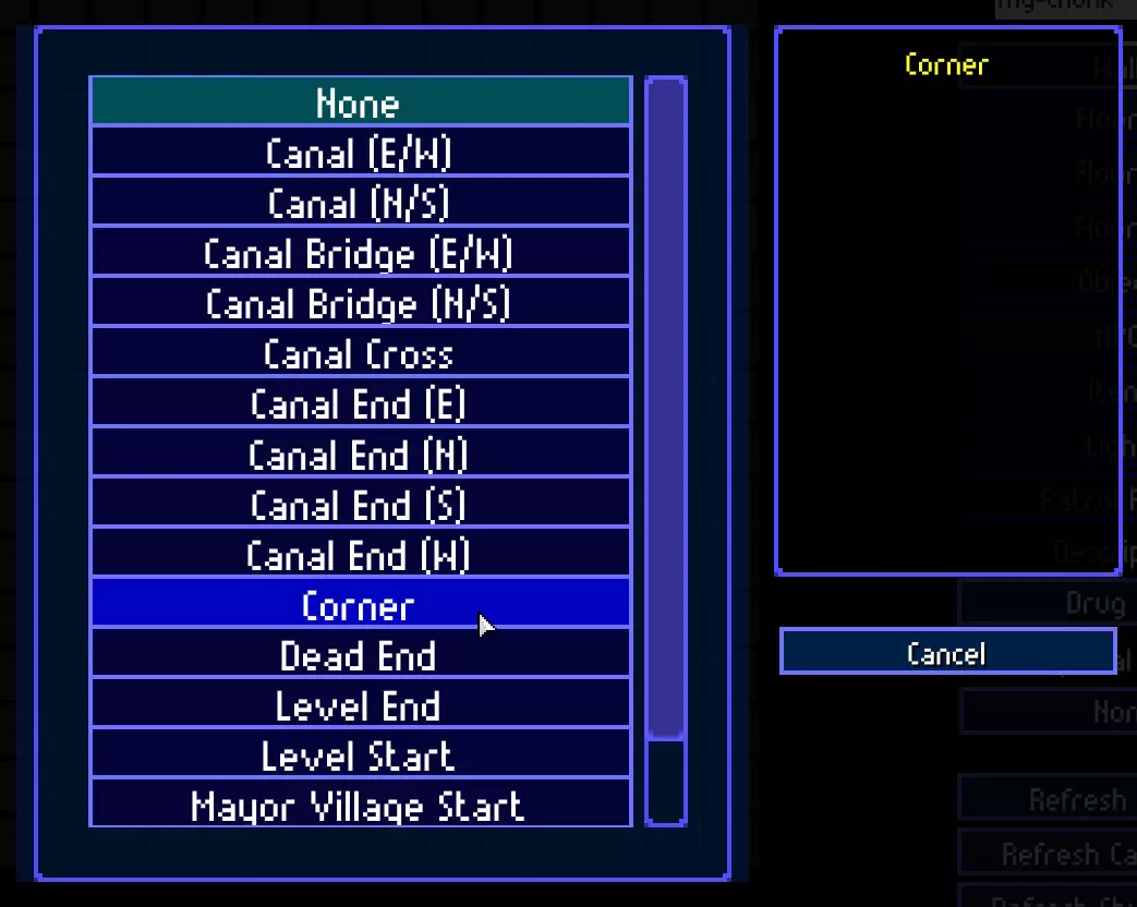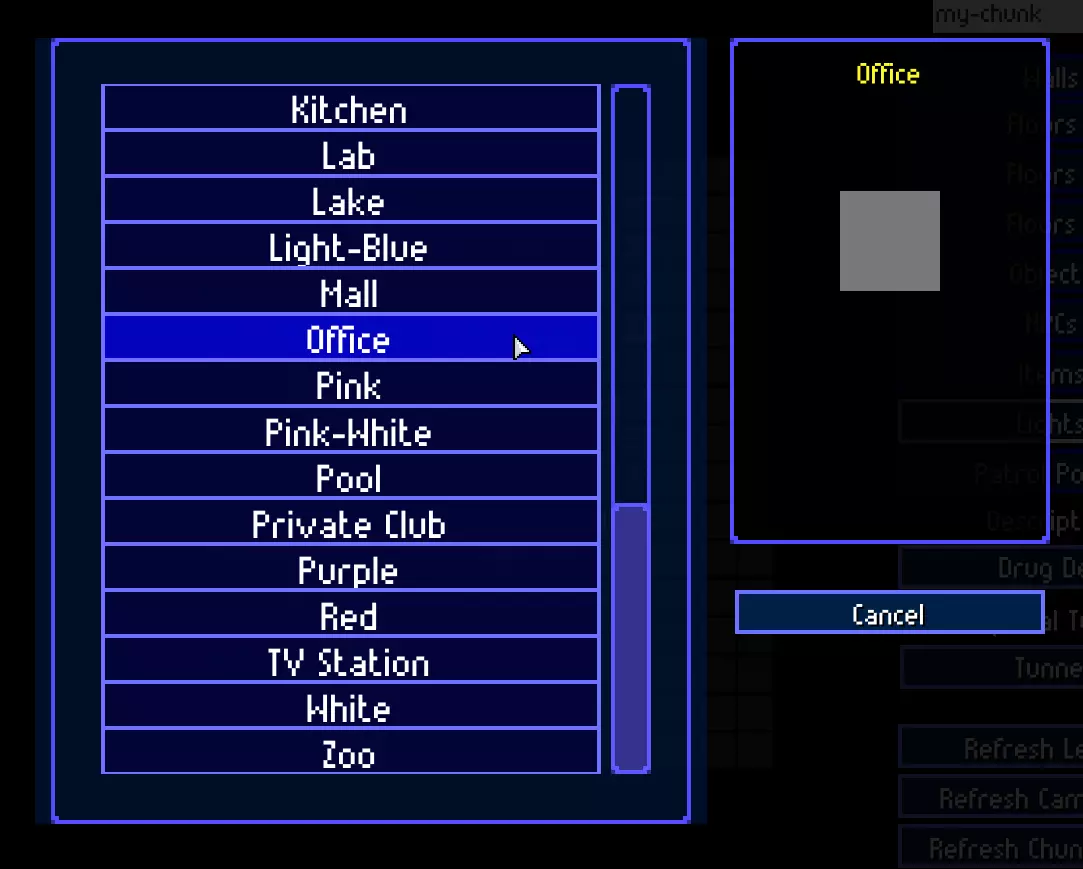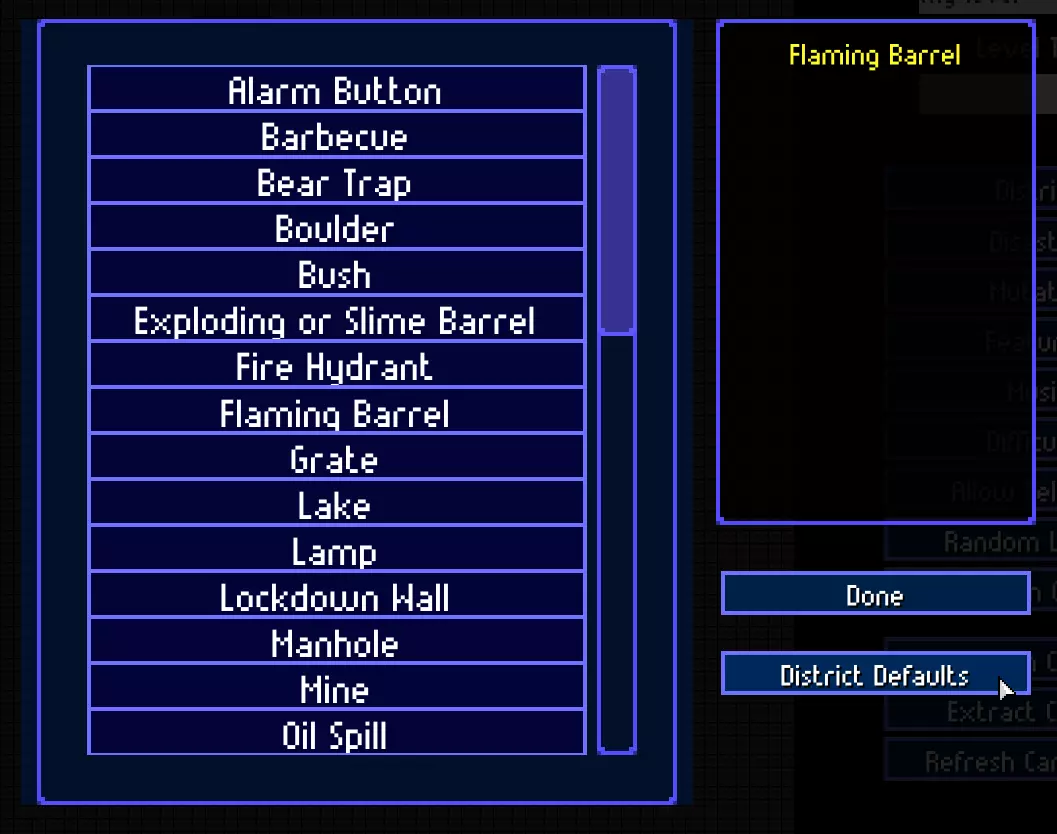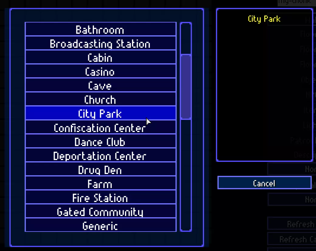 让我们为区块添加描述。它会影响部分物体设置、NPC行为以及关卡中的区块生成。例如,洞穴和农场只会在公园区域生成,毒品窝点不会在市中心区域生成,等等。