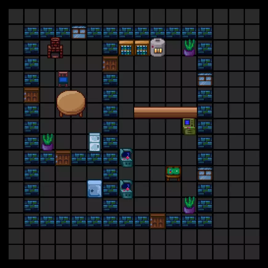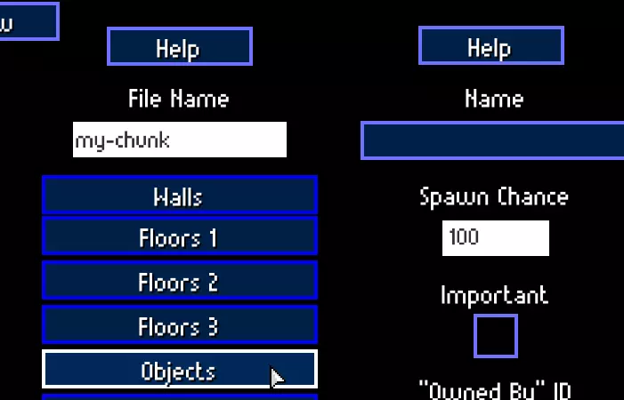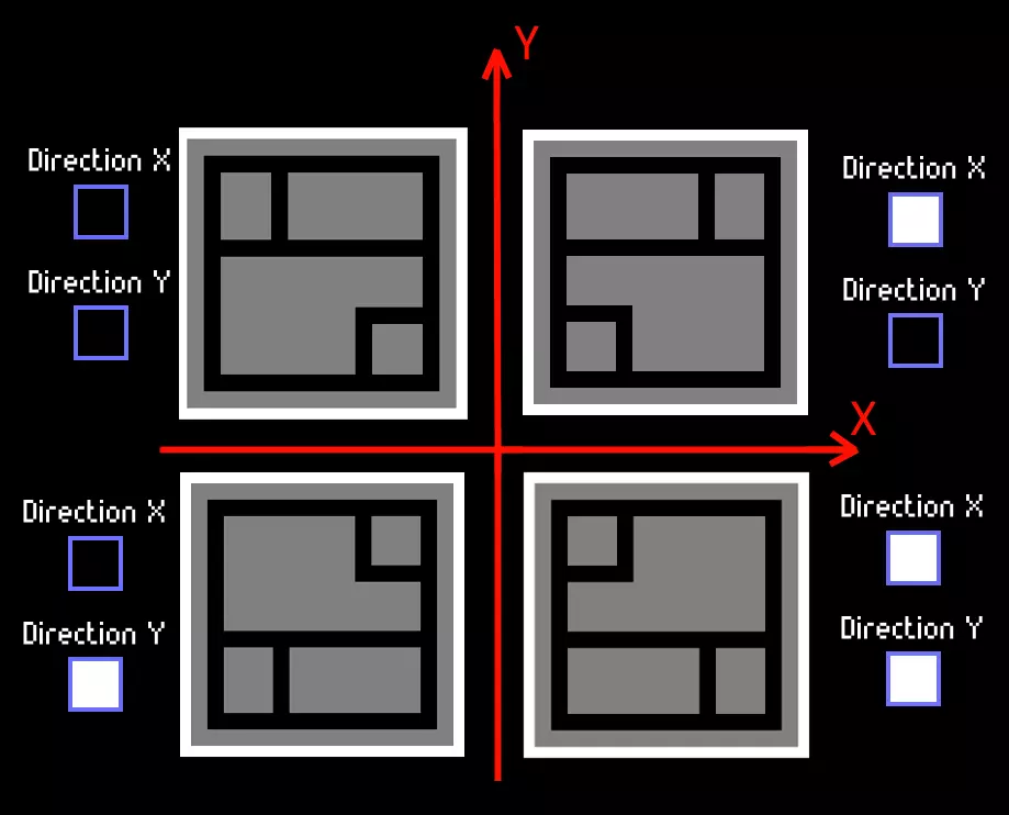1x1的小型区块也有特殊类型。【死胡同】类型的区块会在左侧、顶部和右侧生成墙壁。【隧道】类型的区块会在左侧和右侧生成墙壁。【单侧墙壁】类型的区块会在顶部生成墙壁。【拐角】类型的区块会在左侧和顶部生成墙壁。【无】类型的区块可以在任意位置生成。