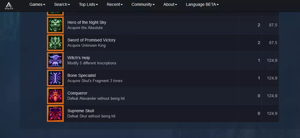 木质雕像 技能冷却速度提升100% 受到伤害会使该物品效果失效10秒。 --疯狂的冷却速度。 简单来说 -获取史莱姆 -获取无敌头骨 -获取精华和技能冷却 -疯狂使用技能。 所有图片均来自小骨百科。《小骨:英雄杀手》更新日志 2023年2月12日 - 创建指南 2023年2月13日 - 修正所需的准确百分比,添加关于死神的信息 2023年2月26日 - 添加视频,添加关于石像鬼的注释,将Magus Sisters修正为Leiana Sisters 2023年4月29日 - 添加在Steam大屏幕模式中开启Turbo的步骤 2023年11月21日 - 添加DLC Boss,修正传承被动(1),添加变异铭文变体的详细信息 视频 关于视频的说明: 无伤挑战是在暗镜模式7(金色石像鬼)和8(黑暗英雄 - 青铜石像鬼)中完成的。 无伤意味着屏幕不会红屏震动,护盾也不会受到伤害。由于我已经获得了成就,所以成就不会显示。请注意战斗开始和结束时的生命值和护盾。在与黑暗英雄的战斗中,发光石的护盾会因持续时间结束而消失。 无伤击败黑暗英雄的注意事项: 黑暗英雄首次阶段变化后(他会发出尖叫,随后出现跟随你的闪避线),会随机开始将你吸过去以吸取生命值。作为史莱姆,你无法闪避/冲刺,因此很难躲避此技能。尝试待在与他相对的屏幕另一侧,直到他发动吸取。动画结束后,你可以自由攻击他,因为他再次使用该技能前有冷却时间。此外,如果你确实被抓住,尽量保持史莱姆形态,这样他会回血,但你不会受到伤害(普通骷髅形态的无敌帧不足以躲避真空吸取)。当黑暗英雄生命值较低时,他会尝试使用【破盾】技能。他会抓住你并发动【撕裂】攻击。尽管看起来你受到了伤害,但由于护盾和生命值未受到任何损伤,这仍算作无伤。 2023年11月21日 2023年11月15日,游戏新增了DLC,加入了新的Boss。该DLC还带来了新的成就,其中包含2个额外的Boss无伤挑战机会。根据Astat的数据,这些成就已植入游戏中。 我完成了最后2个DLC Boss的无伤挑战,但相关成就并未添加到正式游戏中。截至2023年11月21日,DLC Boss的无伤挑战仅为娱乐目的。
