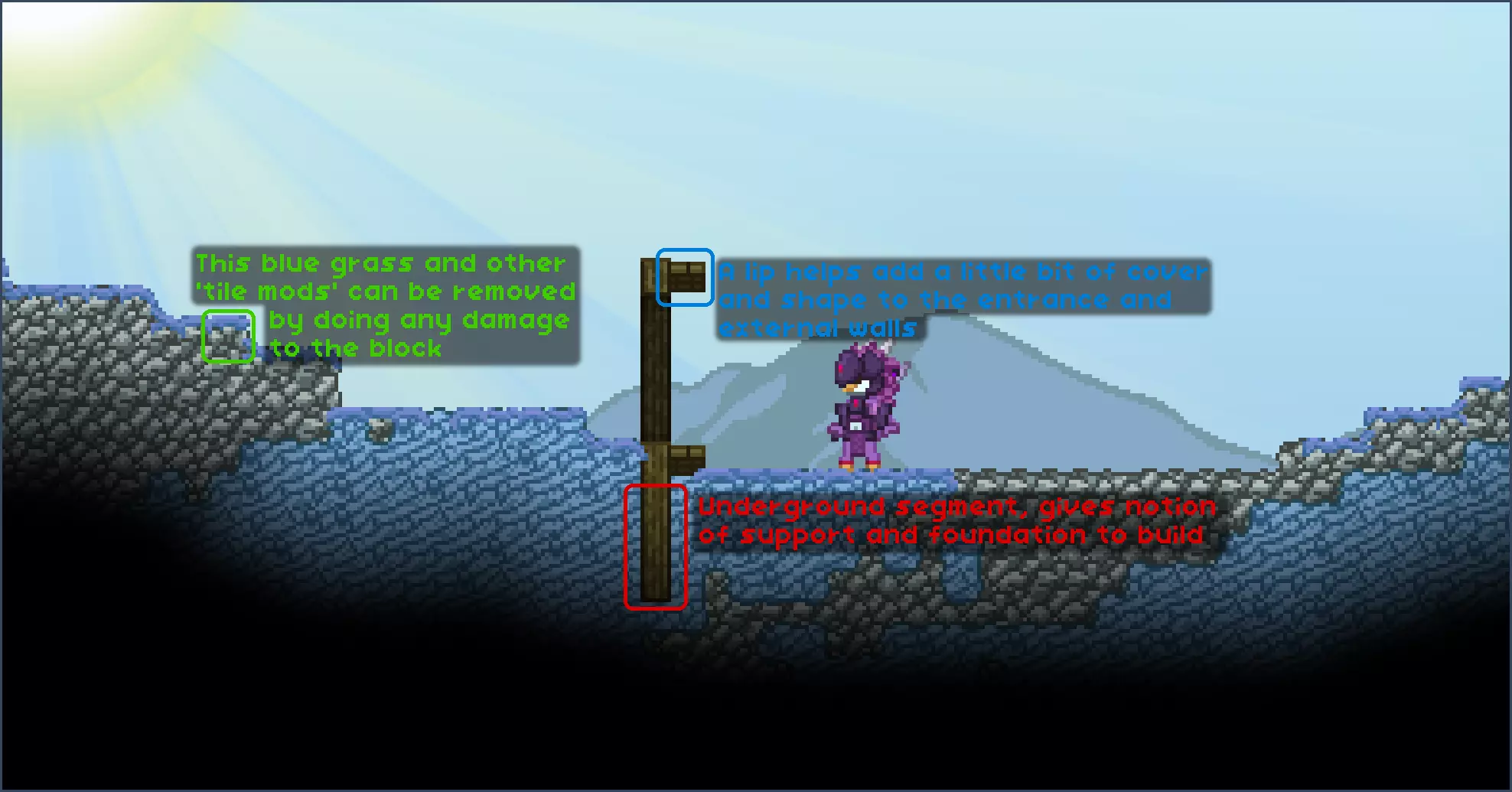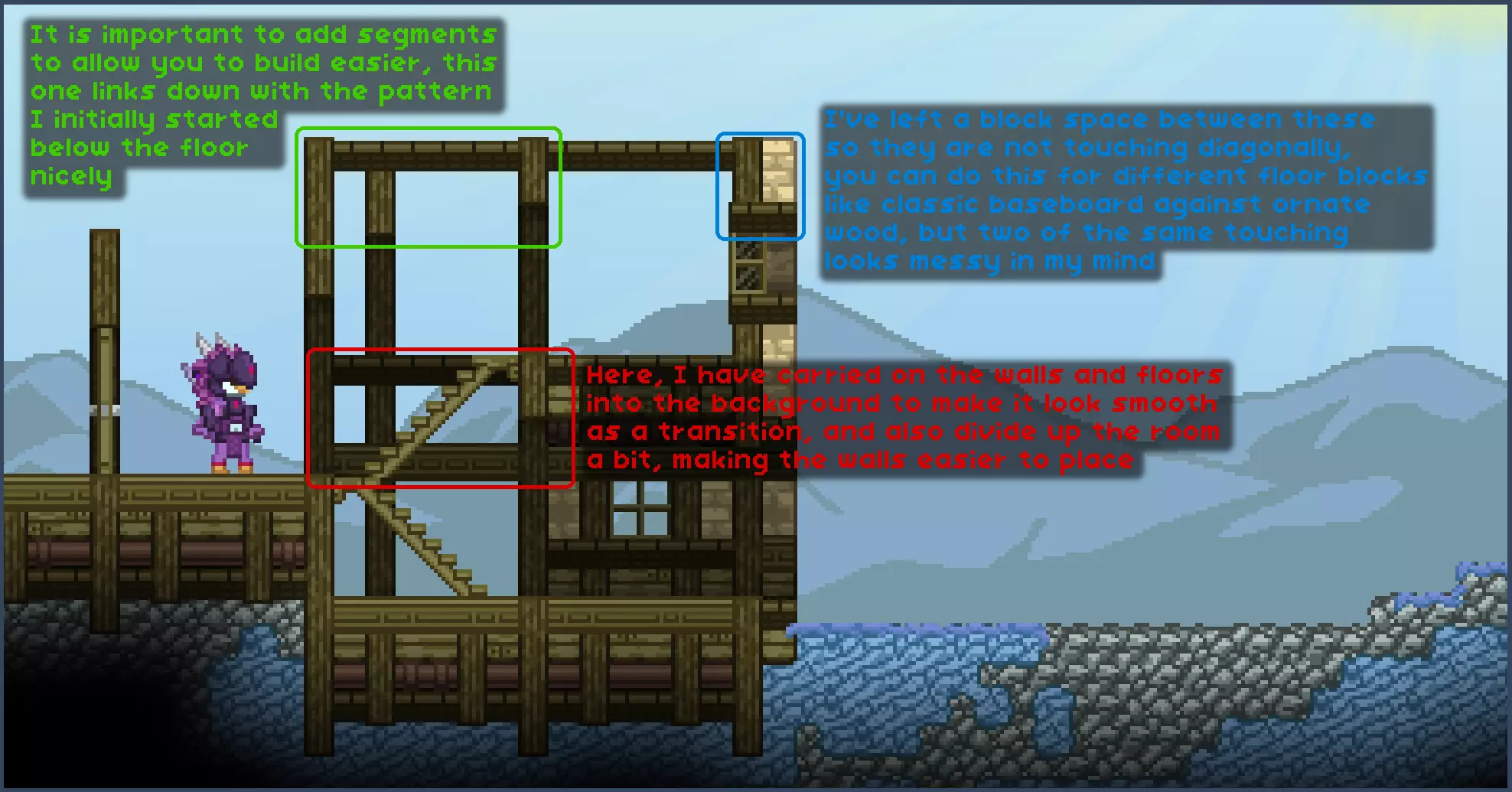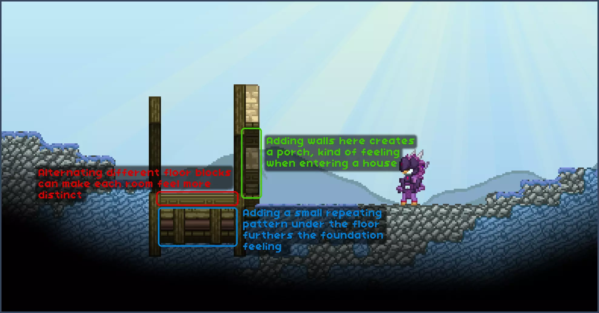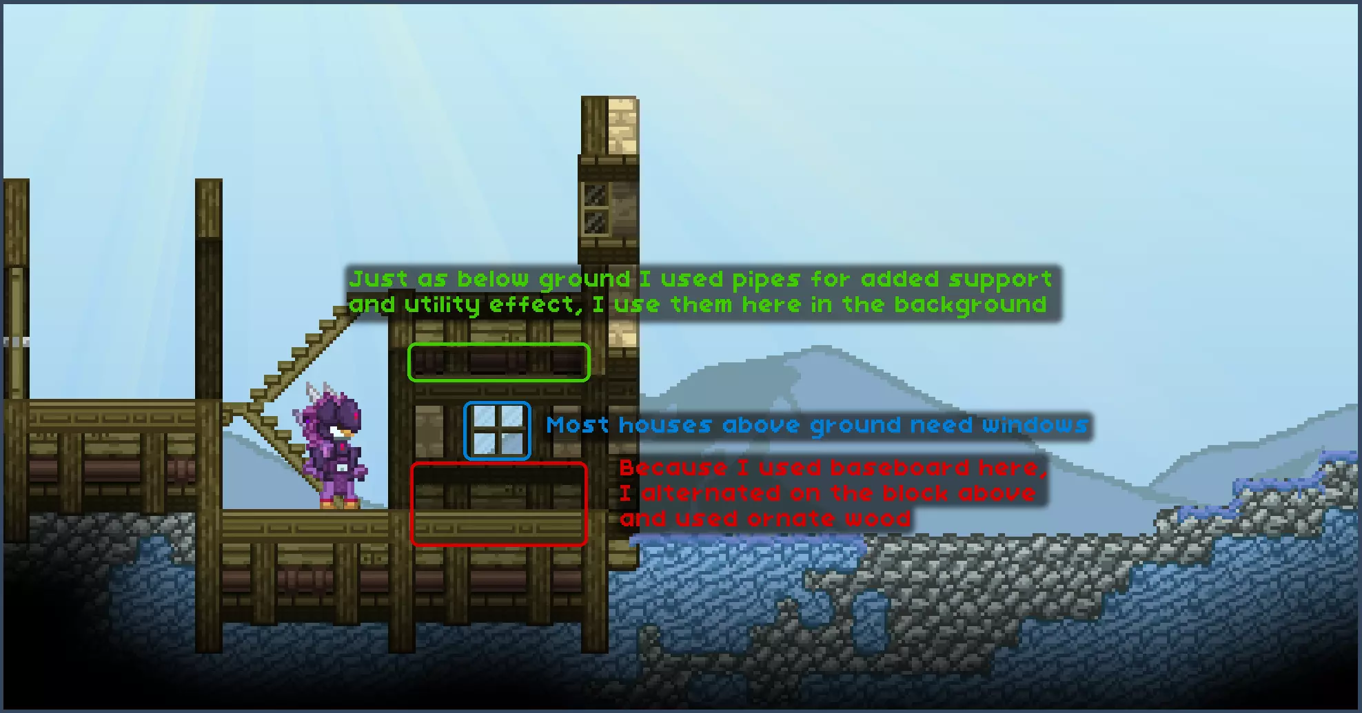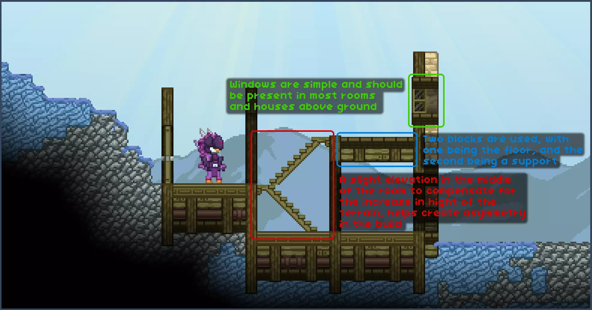 为了便于本指南的讲解,我将方块分为不同类别: 类型1方块 - 墙壁和背景方块,它们能增加纹理,主要用作建筑的墙体。 类型2方块 - 支撑和装饰方块。它们能提供“骨架”般的支撑,并为建筑增添独特的图案。 类型3方块 - 屋顶瓦片/方块。在第一个示例中明显没有,因为游戏中的前哨站没有特定的屋顶瓦片。 其他方块 - 可以是任何其他方块,我喜欢用管道为某些墙壁增添实用感。