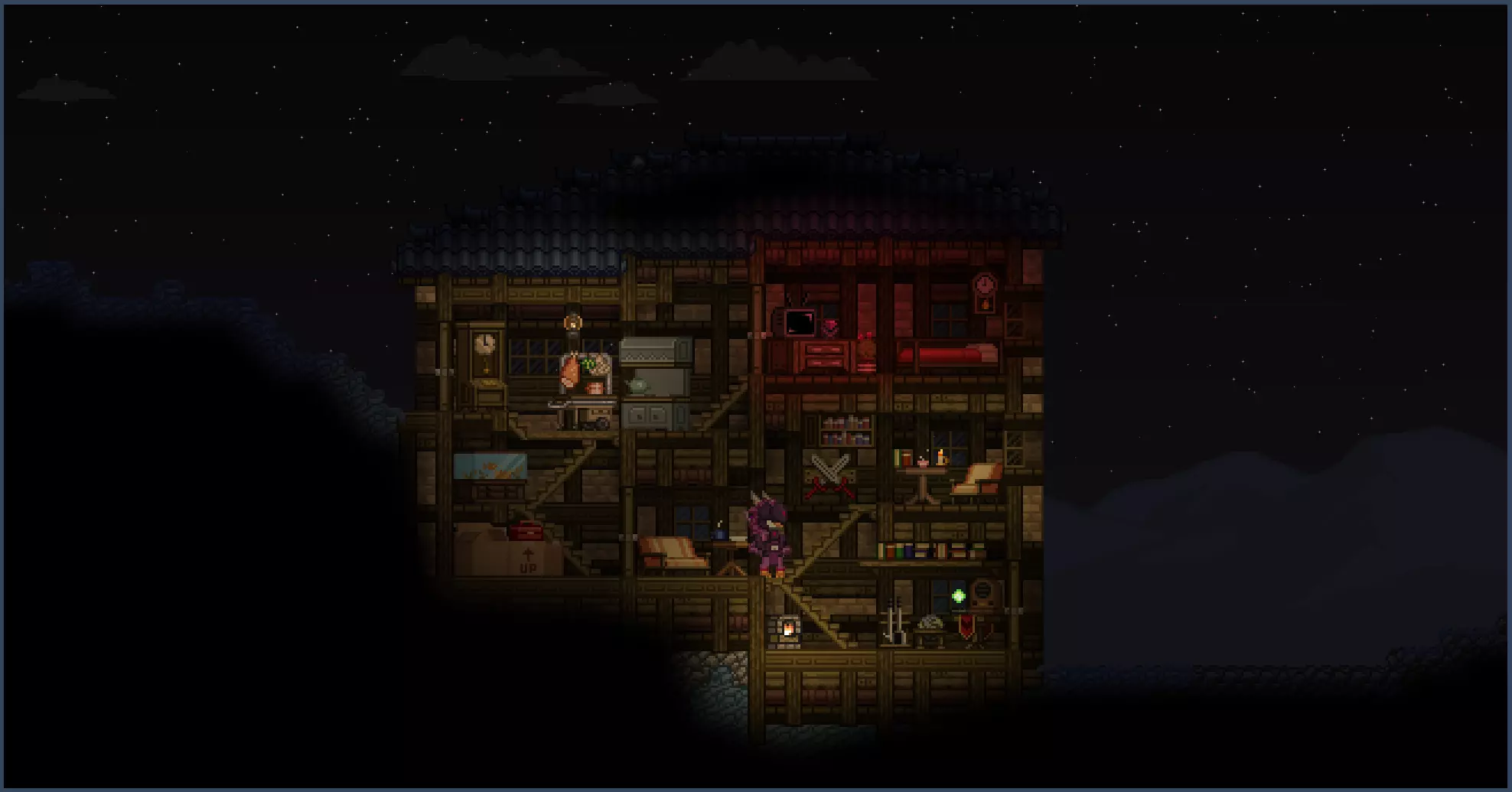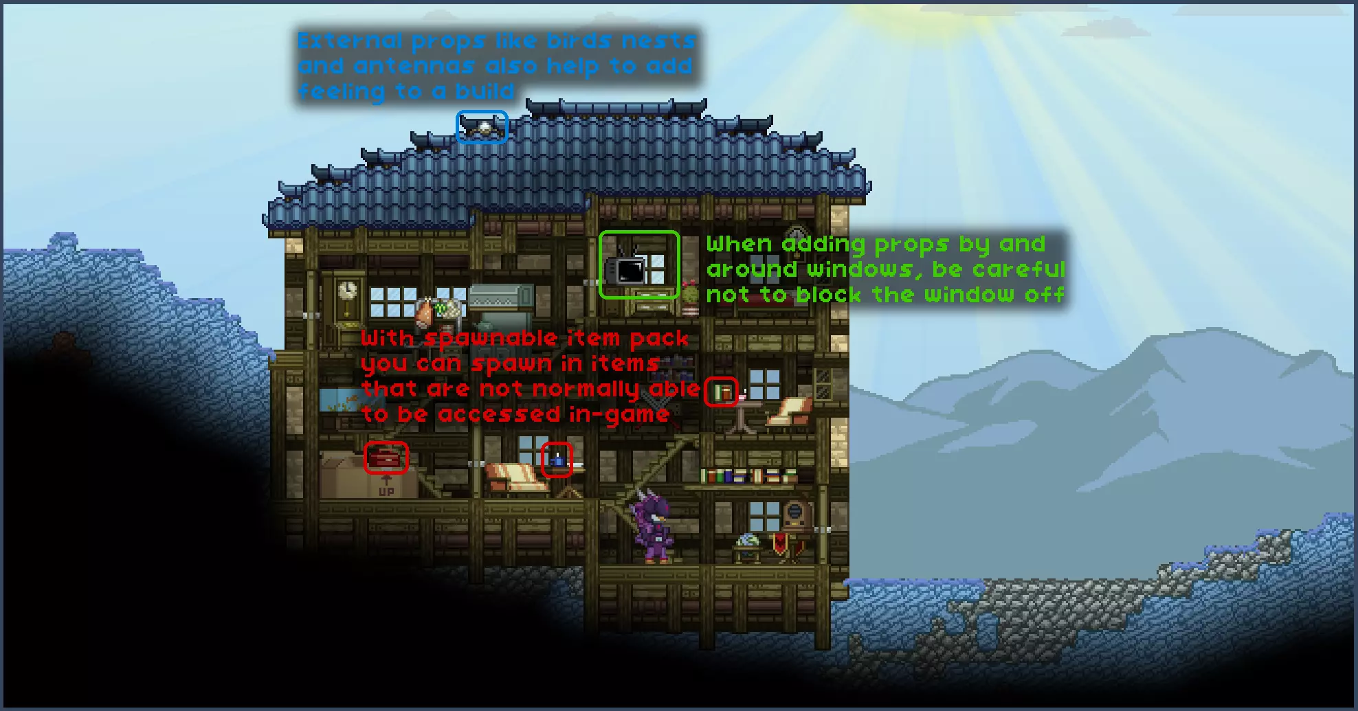 我必须强调,可生成物品包在建造和装饰建筑时非常有用,因为它能让你获得游戏中一些外观更好的道具,而这些道具通常是无法获取的。 进行建筑照明时,我强烈建议如果你启用了单色光和全亮模式,请将它们关闭。我个人在建造时不会使用这两种模式,因为我喜欢观察某些房间的黑暗程度,并据此规划照明或窗户。