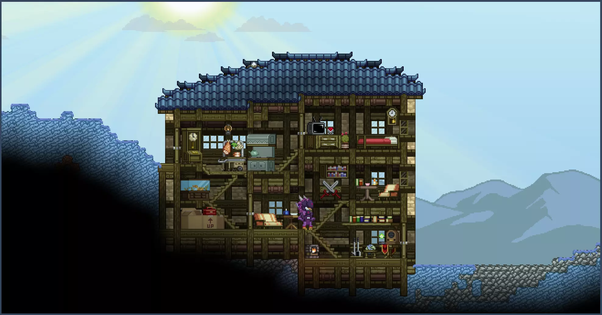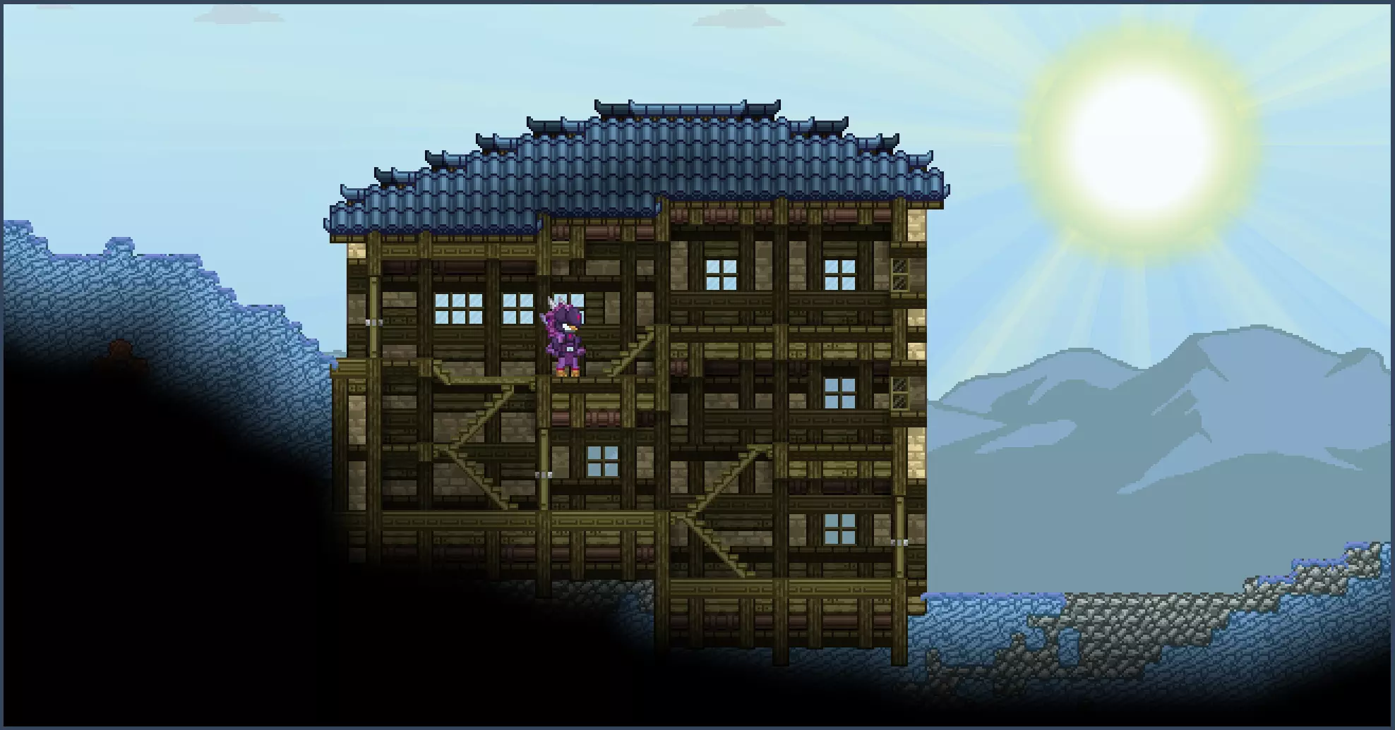 由于楼梯的特性,你可以根据自己的想法将它们设计得更具装饰性或更注重功能性。我实在无法给出具体的建议,因为就连我自己的方法有时也会显得有些复杂,或者可能不如其他人的设计美观。建造一楼时,你基本遵循与一楼相同的规则,只是需要在顶部加盖屋顶。所以,如果你愿意的话,可以继续添加更多楼层! 头顶上的屋顶