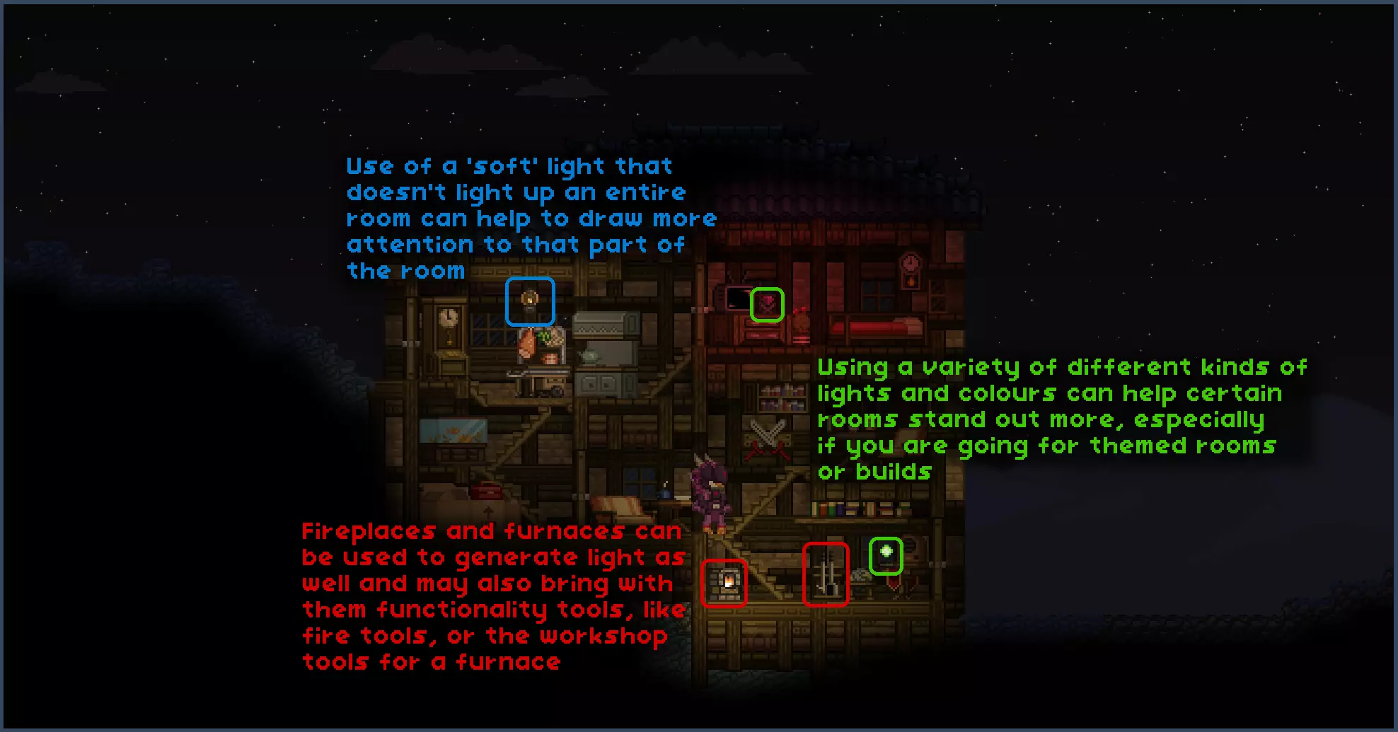灯光和其他家具一样,通常应尽量与建筑风格相协调,并搭配互补的颜色。像荧光灯这类灯具可能对我的建筑来说过于刺眼和明亮,所以我选择了更柔和的火焰和灯具。 在完成所有这些之后