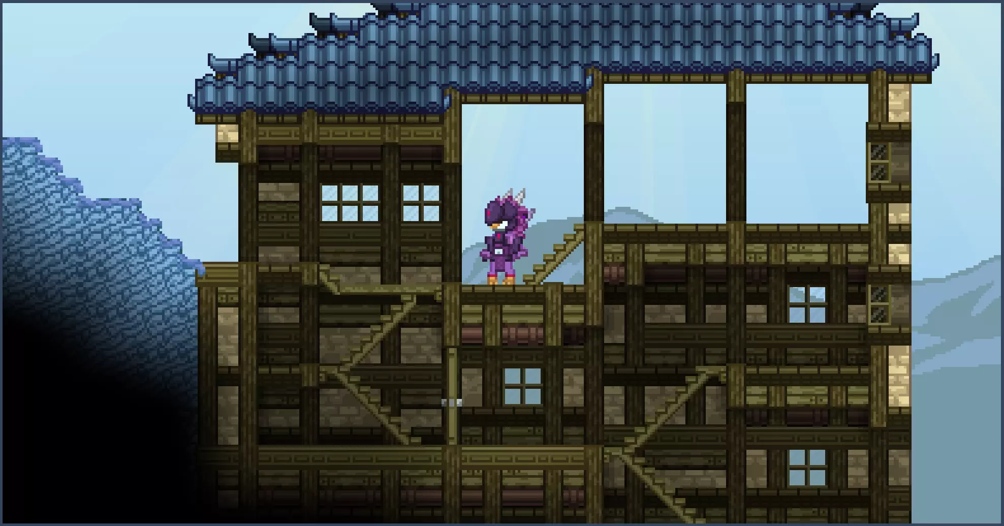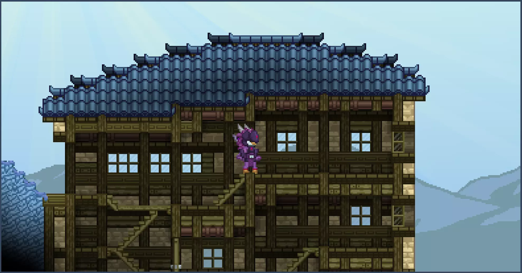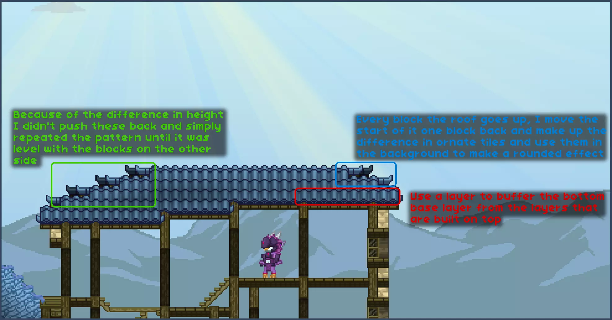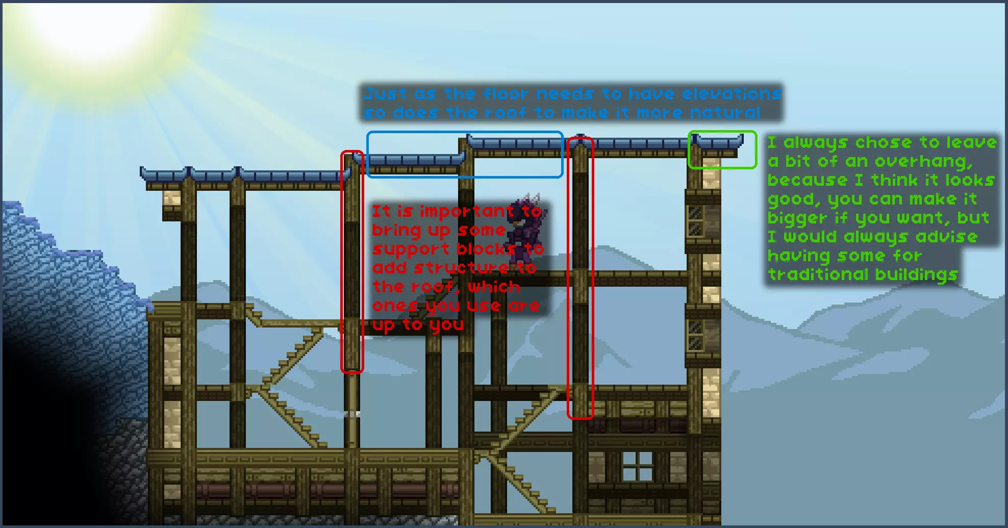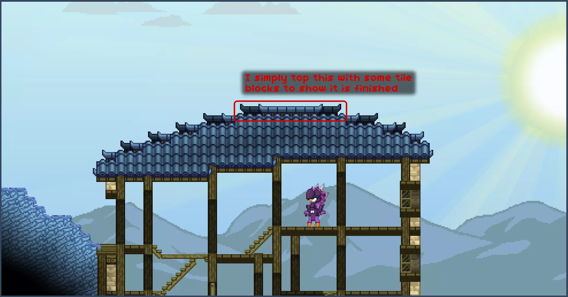 请注意,你也可以用小屋屋顶方块来遵循这种风格,这样你只需使用一种方块而非两种。最终效果应该类似,但为了更好地说明我的思路,我会使用华丽屋顶方块和瓦片方块。