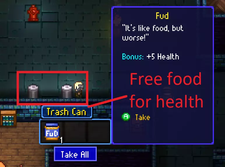与其把你本就不多的时间和金钱浪费在各种自动售货机上,不如去找垃圾桶。你要么能找到钱,要么能找到一些食物或注射器。食物能为你恢复生命值,让你不至于死亡。注射器可能有同样的效果,也可能会让你中毒,导致你在5到10秒内每秒损失约2点生命值。