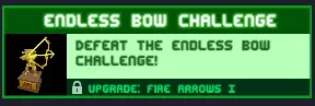 无尽弓箭挑战 击败无尽弓箭挑战! 这是一项艰巨的考验,先提升能量和箭矢宽度,之后提升更多能量再生和减速能力,然后再次升级,不断更换装备,同时不要忘记提升敏捷以对抗蜘蛛机器人和翻斗车。 奖励:【火焰箭I】升级和一个精美奖杯