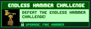 无尽锤子挑战 击败无尽锤子挑战! 首先,将锤子尺寸挥动至最大,然后使用喷气背包+能量+敏捷,即可获得成就。 奖励:【火焰之锤】升级和一个精美奖杯