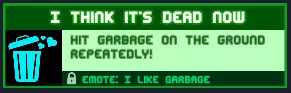 我觉得现在它已经没气了。反复击打地上的垃圾!要获得这个成就,你需要用武器开始击打敌人的残骸。奖励:【我爱垃圾】表情动作