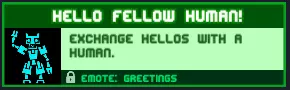 你好,人类伙伴!和人类打个招呼吧。 只需玩一局多人游戏并向他人问好。 奖励:【Greetings】表情