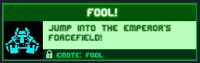 蠢货!跳进皇帝的力场! 要获得此成就,你需要跳到皇帝的王座上。(在地图编辑器中或许可以做到。) 奖励:【蠢货】表情