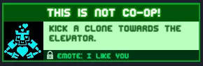 这不是合作模式!把克隆体踢向电梯。要获得此成就,你需要创建一个克隆体并将其踢进电梯。奖励:【I like you】表情