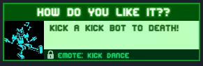 你觉得怎么样?把踢击机器人踢死! 把踢击机器人踢进熔岩、锯子、尖刺等地方。 奖励:【Kick dance】表情