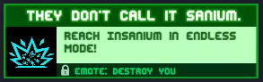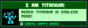 无尽模式相关成就 所有与无尽模式相关的成就都将在这里 I am titanium!:在无尽模式中达到钛级! 如果达到泰坦级对你来说太难,可以查看攻略,或在地图编辑器中练习。 奖励:【开心舞蹈】表情
