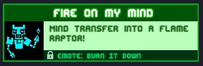 火焰在我心中燃烧,思维转移到火焰迅猛龙身上!你可以在地图编辑器中实现这一点:放置一只迅猛龙,对自己使用思维转移,然后被迅猛龙杀死。奖励:【Burn it down】表情