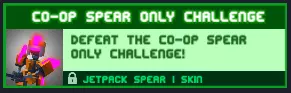 合作模式长矛限定挑战 完成合作模式长矛限定挑战! 长矛是一种难以使用的武器,但即使在这种情况下,也有相应的战术。首先挥动盾牌+最大喷气背包和2-3点能量,然后提升敏捷并使用盾牌反击,之后全力提升能量以及带有护甲的克隆体。 奖励:【Jetpack spearman Mk1】皮肤