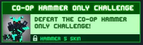 合作模式仅用锤子挑战 完成合作模式仅用锤子挑战! (个人观点)你可以把火焰锤子扔到一边去,因为这是最没用的升级。无脑提升锤子尺寸、喷气背包和敏捷性就行。 奖励:【Hammerman Mk5】皮肤