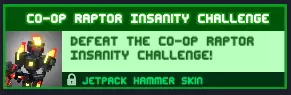 合作模式迅猛龙疯狂挑战 完成合作模式迅猛龙疯狂升级挑战! 简单测试。提示 - 用弓箭击杀迅猛龙会更简单。在无尽模式中下载所有可下载的内容。 奖励:【Jetpack Hammerman】皮肤