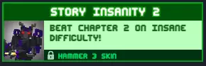 故事疯狂2:在疯狂难度下通关第二章! 要在疯狂难度下通过第二章,需要挥舞火焰剑和箭矢反射器,然后使用分身。尽量让敌人陷入困境,不要让他们靠近,除非对方是弓箭手。 奖励:【Hammerman Mk3】皮肤