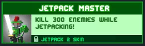 Jetpack master 用喷气背包击杀300名敌人! 放心游玩即可,这个成就会自然解锁,关键是拿到喷气背包并更频繁地使用它。 奖励:【Jetpack swordman Mk2】皮肤