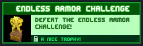 无尽装甲挑战 击败无尽装甲挑战! 所有人都穿着装甲,你也一样,和无尽模式相同,只是所有人都穿着装甲(疯狂模式在一旁紧张地抽烟)。 奖励:一个精美的奖杯