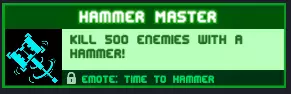 【锤子大师】用锤子击杀500名敌人! 放心游玩即可,这个成就会自然完成,关键是只使用锤子或更频繁地使用锤子。 奖励:【是时候锤了】表情