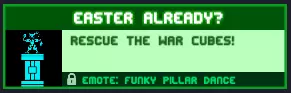 复活节已经到了?快去解救战争方块! 在第二章第七关,跳过蹦床后立即左转,然后进入通道走到尽头。 奖励:【Funky pillar dance】表情动作