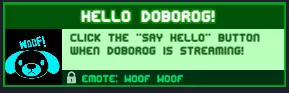 所有隐藏成就都相当简单。 其他成就 本节包含各种不属于其他类别的成就。 你好,多博罗格!当多博罗格进行直播时,点击“打招呼”按钮! 等待埃里克(开发者/多博罗格)的直播,然后进入游戏,埃里克会在那里挥手,点击他,并且你还必须在设置中启用“直播通知”。 奖励:【汪汪】表情