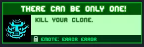 只能有一个!杀死你的克隆体。 要获得此成就,你需要摧毁自己的克隆体。 奖励:【Error-Error】表情