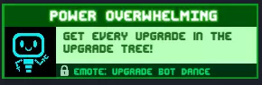 势不可挡 解锁升级树中的所有升级! 小贴士:加入任意开放的无尽模式合作游戏即可,因为你很可能会遇到两名拥有【Insanium 68】(随机数字)的玩家,之后就能完成所有升级,因为你会获得多达68点(同样为随机数字)升级点数。 奖励:【升级机器人之舞】表情