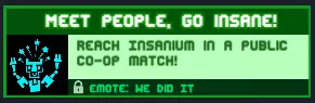 结识他人,陷入疯狂!在公开合作模式比赛中达到疯狂状态! 小贴士:加入任意无尽模式的公开合作游戏即可,因为你很可能会遇到两个已处于68级疯狂状态的玩家。(数字仅为示例) 奖励:【We did it】表情