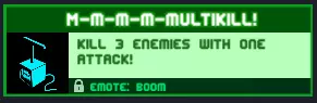 M-m-m-m-multikill:用一次攻击消灭3个敌人!(并非只能用锤子完成)用锤子完成这个成就是最容易的,只需将锤子升级到最高级,聚集敌人然后全力砸下去。奖励:【Boom】表情
