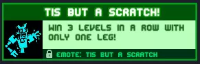 不过是点小伤!仅用一条腿连续赢得3个关卡! 有了喷气背包,你甚至不会感觉到少了一条腿,而且这个成就很可能在你玩游戏的过程中自然而然地达成。 奖励:【不过是点小伤】表情