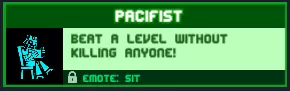 和平主义者:不击杀任何人通关一个关卡! 只需等待带有锯子、尖刺、熔岩、陷阱等的关卡,然后移动让敌人撞上这些陷阱死亡即可。 奖励:【坐下】表情动作