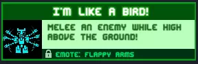 我像只鸟!在高空时近战攻击敌人!这是个非常简单的成就,只需再次将锤子调整到最大尺寸并使用蹦床,所有成就都能轻松获得。奖励:【Flappy arms】表情