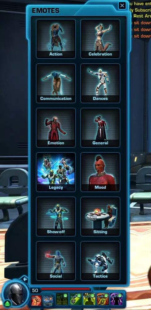 /t - 向其他玩家发送私聊消息。 /tell - 向其他玩家发送私聊消息(/t的替代形式)。 /whisper - 向其他玩家发送悄悄话。 /reply - 回复悄悄话。 /r - 回复悄悄话(/reply的替代形式)。 /who - 打开【谁在线】窗口。 /say - 将输出聊天切换为【普通说话】,只有附近的玩家能看到。 /yell - 在聊天中大喊,显示为红色文本,可在较大范围内被看到。【全阵营】- 在公共聊天频道发言,整个星球/闪点/副本内的玩家都可能听到。 【队伍】- 邀请目标玩家加入队伍。 【邀请】- 邀请玩家加入队伍。 【卡住】- 帮助玩家脱离卡住的环境。 【提交漏洞】- 允许玩家提交漏洞报告。 【登出】- 将玩家退出游戏并返回角色选择界面。 【退出】- 完全结束游戏。 【解散】- 解雇您的同伴。/nameplates – 显示玩家姓名板 /npc nameplates。 /trade – 在交易频道发言。 /pvp – 在PvP频道发言。 /1 – 综合聊天快捷键。 /2 – PvP频道快捷键。 /3 – 交易频道快捷键。 /4 – 自定义聊天频道。 /5 – 自定义聊天频道。 /6 – 自定义聊天频道。 /7 – 自定义聊天频道。 /8 – 自定义聊天频道。 /9 – 自定义聊天频道。 /0 – 自定义聊天频道。/emote - 允许玩家输入自定义表情动作(例如,输入“/emote punts the Ewok”会显示为“玩家名称 punts the Ewok”)。 /hideui - 隐藏用户界面,也可以使用Alt + X组合键隐藏界面,按两次Ctrl + U重置界面。 /dnd - 将状态设为【请勿打扰】,适合希望在银河中不受打扰时使用。/inspect – 查看其他玩家信息。 /selljunk – 命令你的同伴去卖掉你所有的灰色物品。 /guild – 仅你的公会成员可见的聊天频道。 /gquit – 退出当前公会。 /ginvite – 邀请目标玩家加入公会。 /friend – 将玩家添加到你的好友列表。 /follow – 跟随目标玩家。 /flag – 将自己标记为PvP状态。